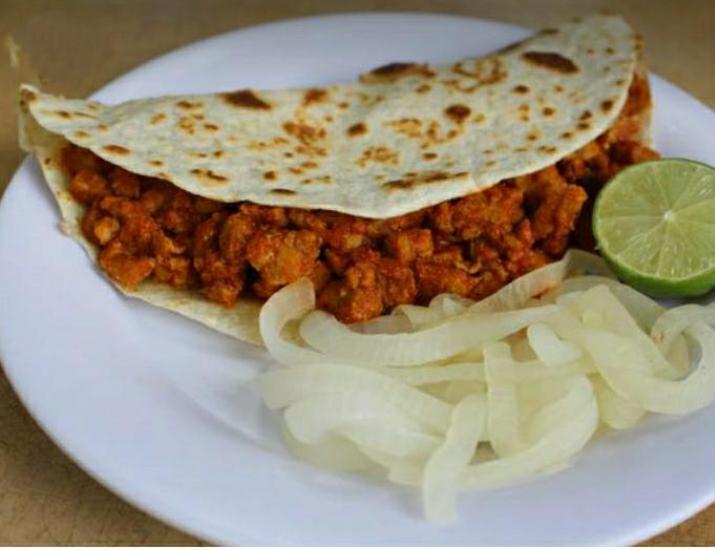 Taco individual de frijol con chorizo en tortilla de harina o maíz.