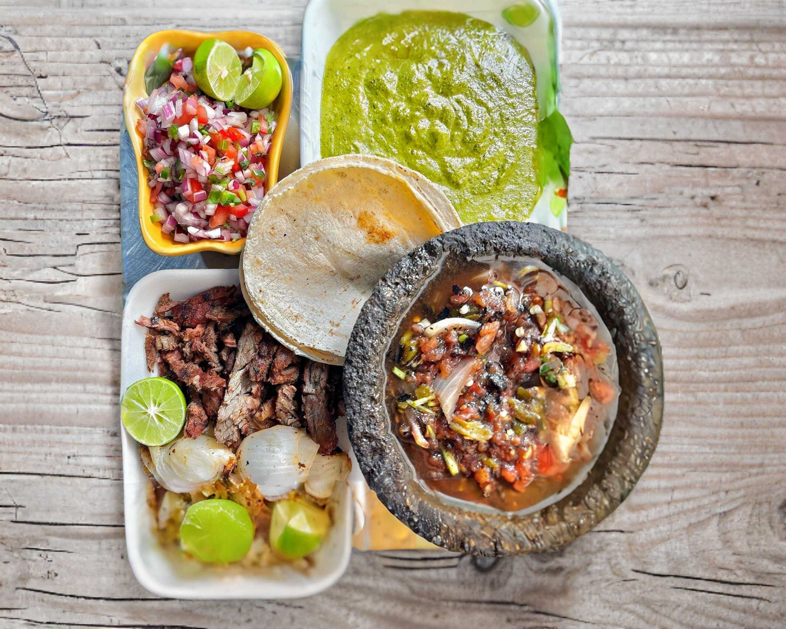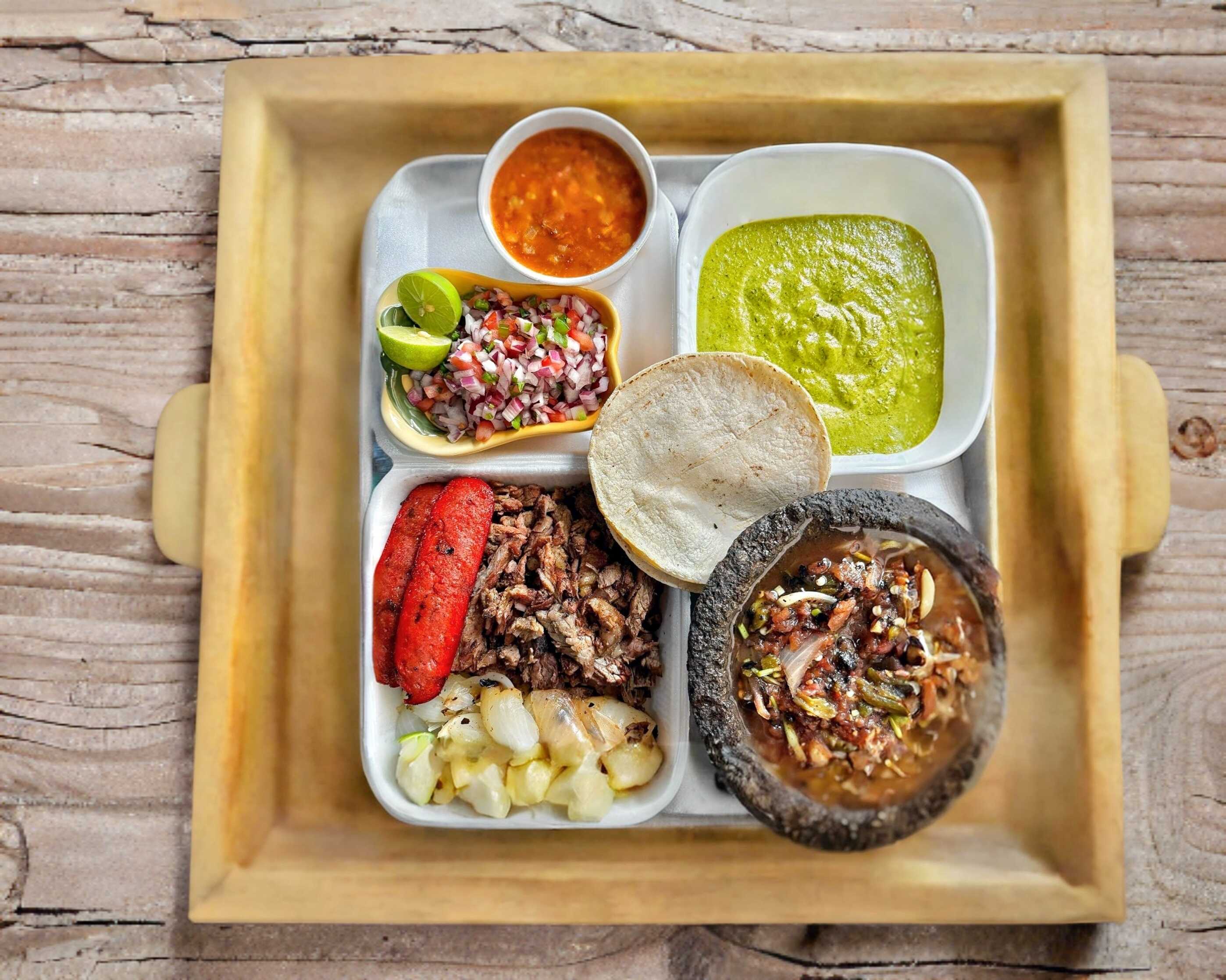 Orden personal, tortillas, cebolla asada, pico de gallo , salsa roja molcajeteada, salsa verde cremosa.