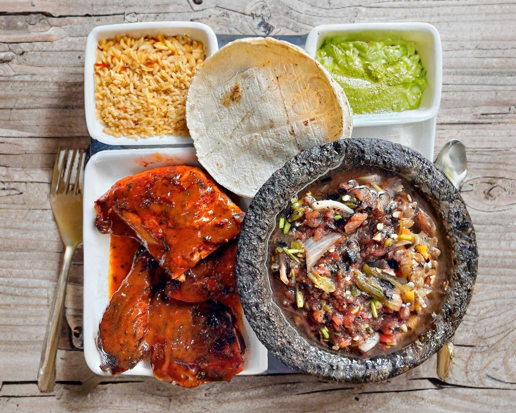 Incluye: arroz, tortillas , salsa roja molcajeteada y salsa verde cremosa