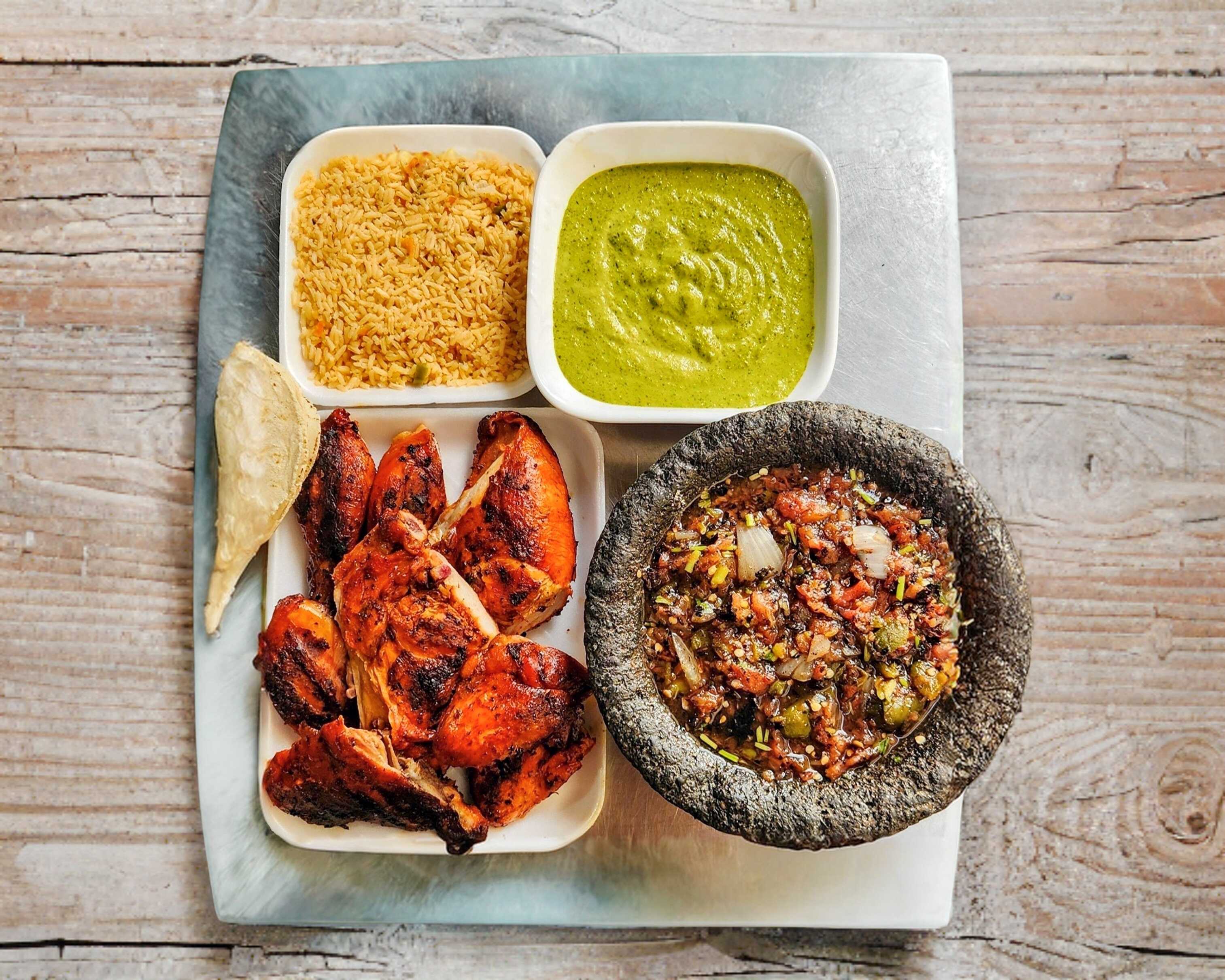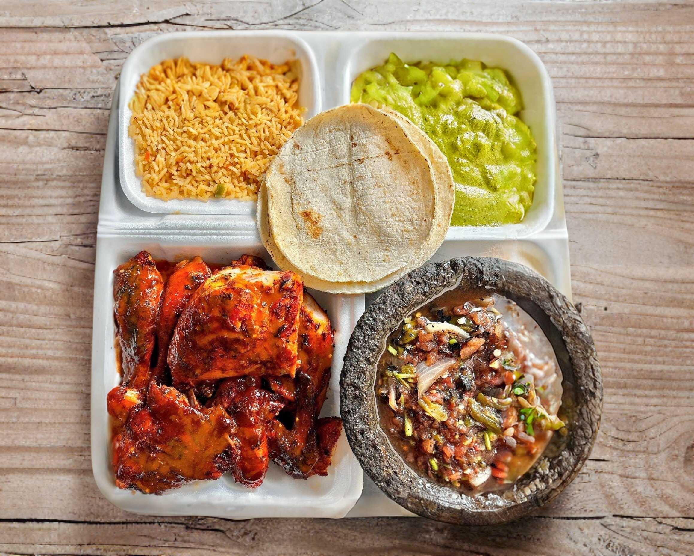 Incluye: Medio pollo bañado en nuestra rica salsa chilismorris , arroz , tortillas, salsa roja molcajeteada, y salsa verde cremosa.