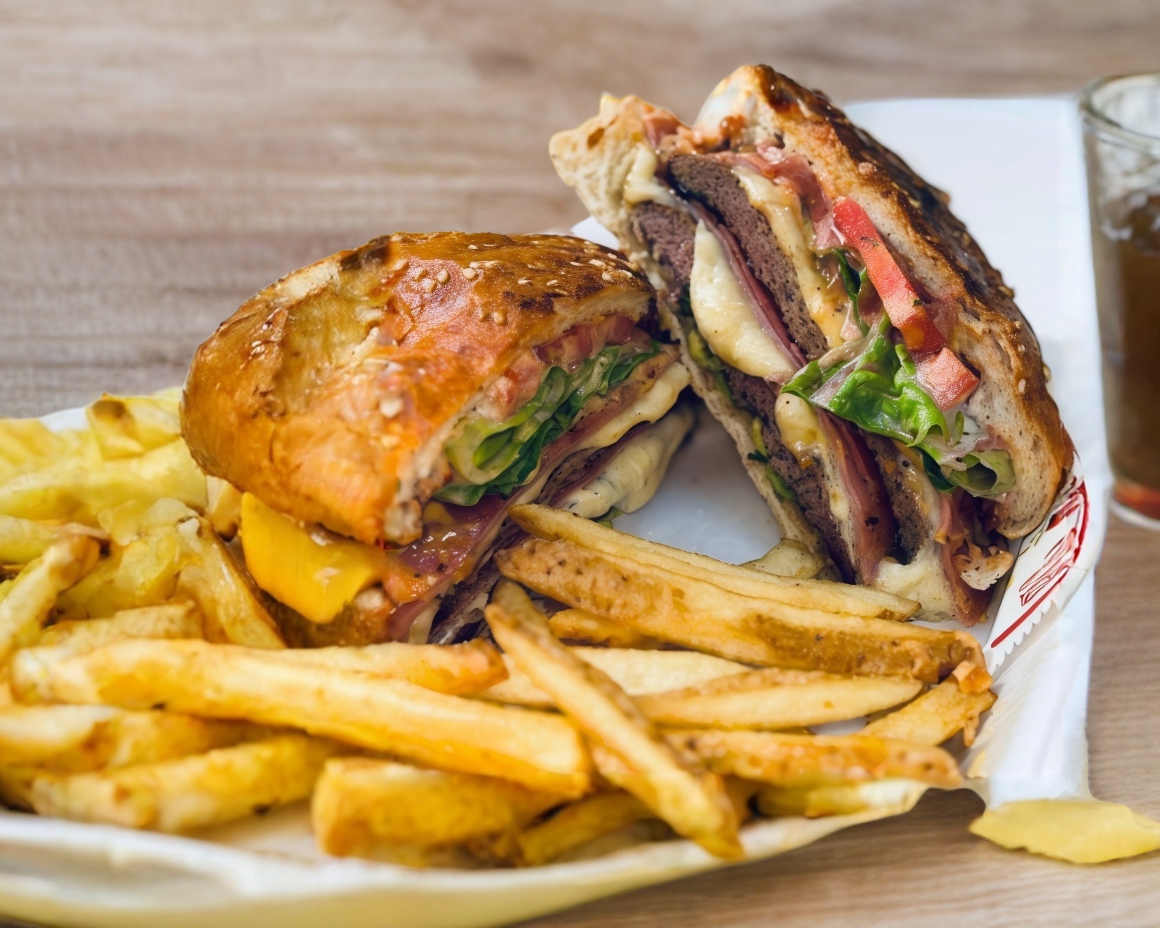 Incluye: carne de hamburguesa, carne asada ( top sirlon) queso manchego, jamon , salami,aguacate,tomate ,lechuga y papas a la francesa.