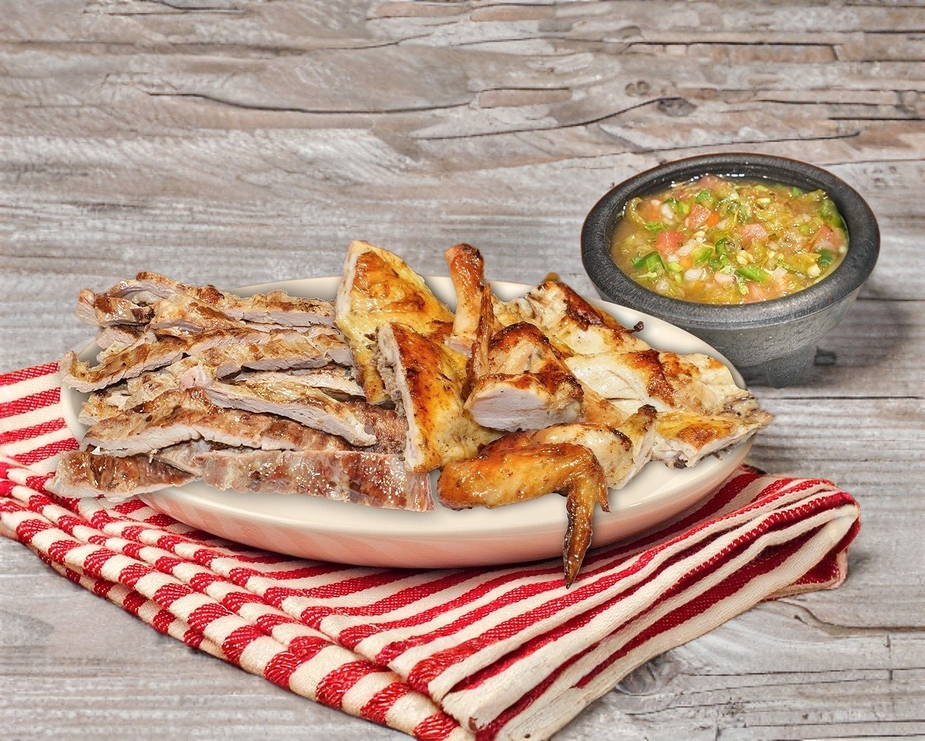 1/2 pollo, cebolla, tortillas, salsa y limón. (4 pzas).