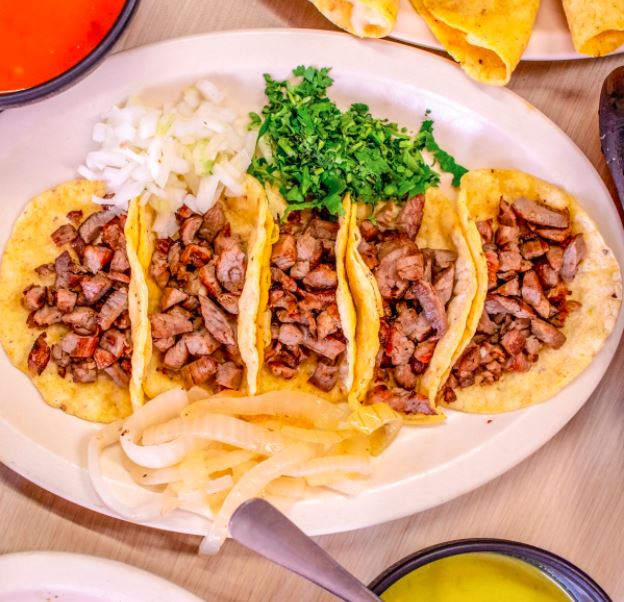 5 TACOS DE BISTEK CON CEBOLLA, CILANDRO PORCION DE CEBOLLA DORADA Y PAPA GALEANA SALSA Y LIMON