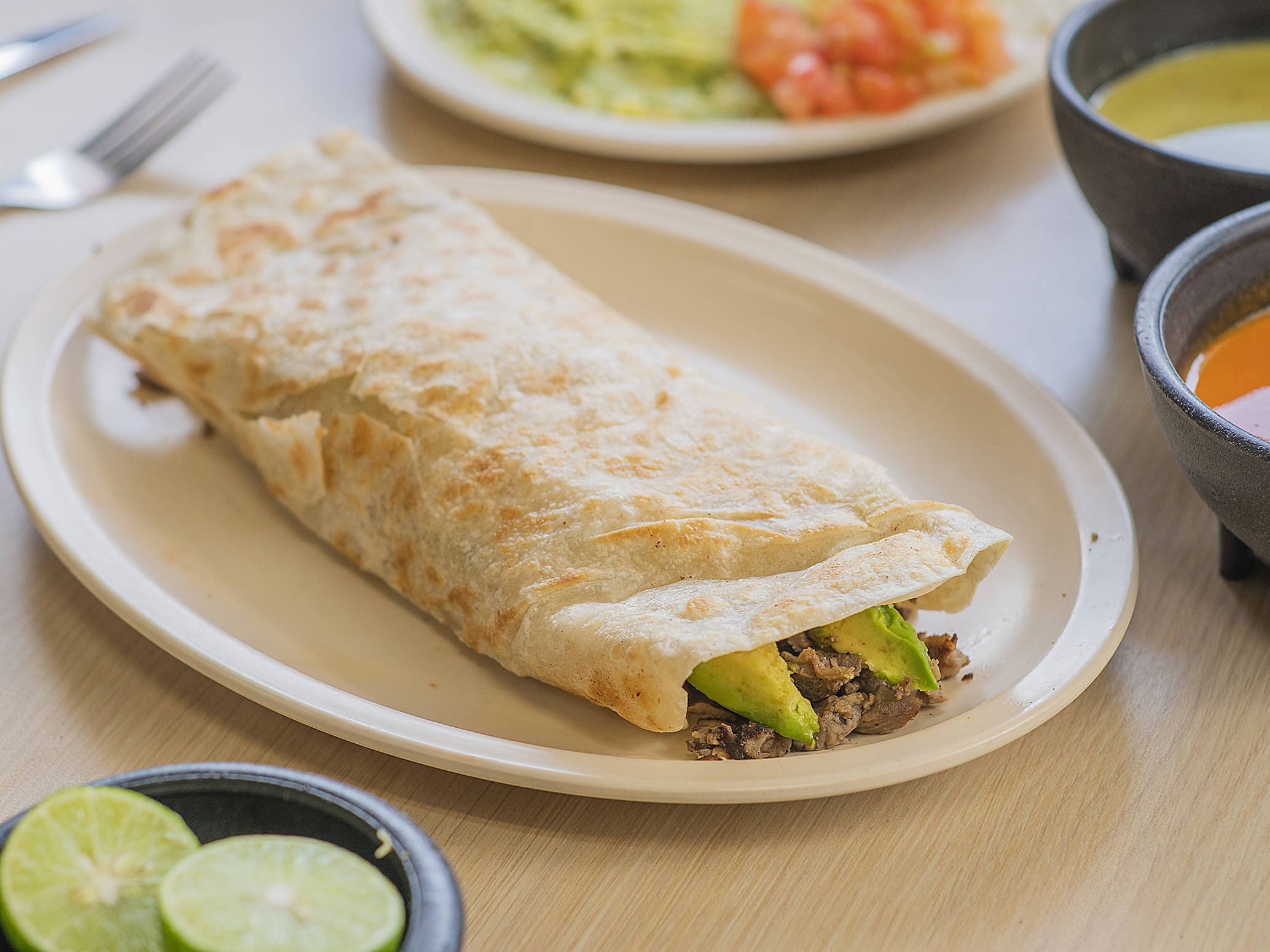 TORTILLA DE HARINA GRANDE CON QUESO, CARNE DE ARRACHERA AGUACATE