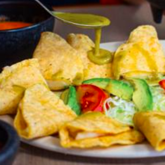 5 FLAUTAS DE POLLO PORCION DE AGUACATE,CREMA LECHUGA TOMATE PAPAS FRITAS Y SALSA