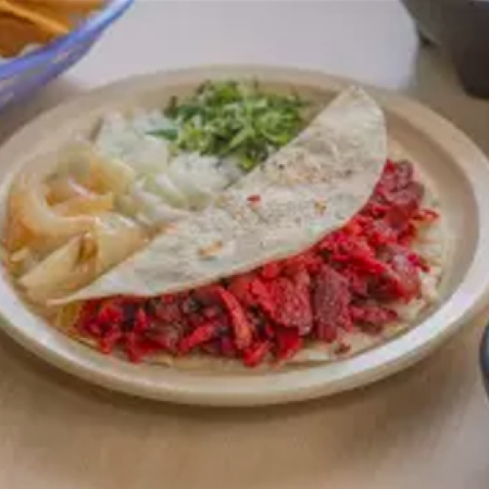 TORTILLA DE HARINA CON PORCION QUESO DE CARNE DE SIRLON Y TROMPO, CEBOLLA CILANTRO Y SALSA