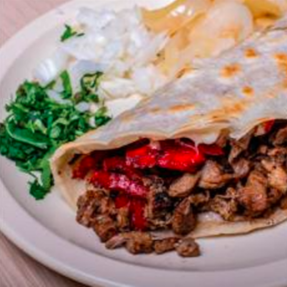 TORTILLA DE HARINA PORCION DE QUESO PORCION DE CARNE DE TROMPO CEBOLLA CILANTRO Y SALSA