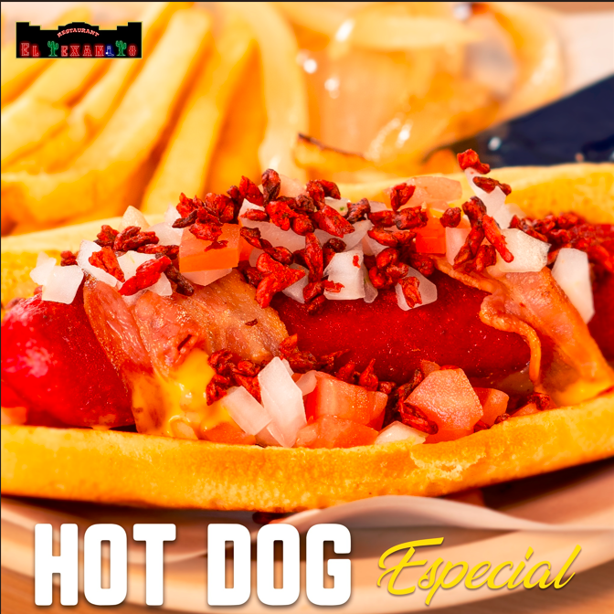 PAN PARA HOT DOG, SALCHICHA CON TOCINO, PORCION DE PAPAS MAYONESA MOSTAZA CATSUP Y CHILE JALAPEÑO