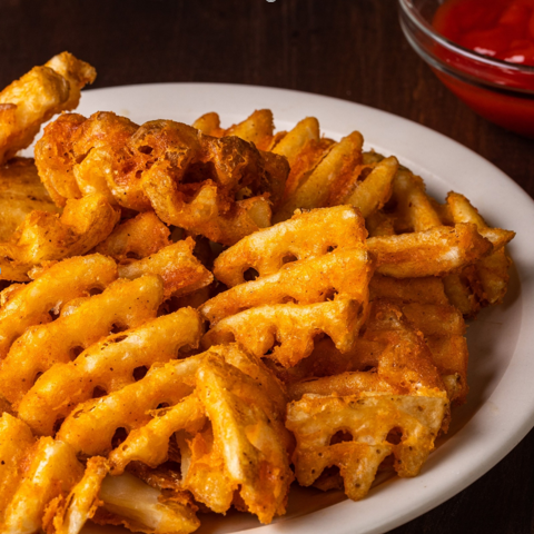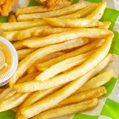 Porción de papas criscut, pollo empanizado en tiras arriba con aderezos