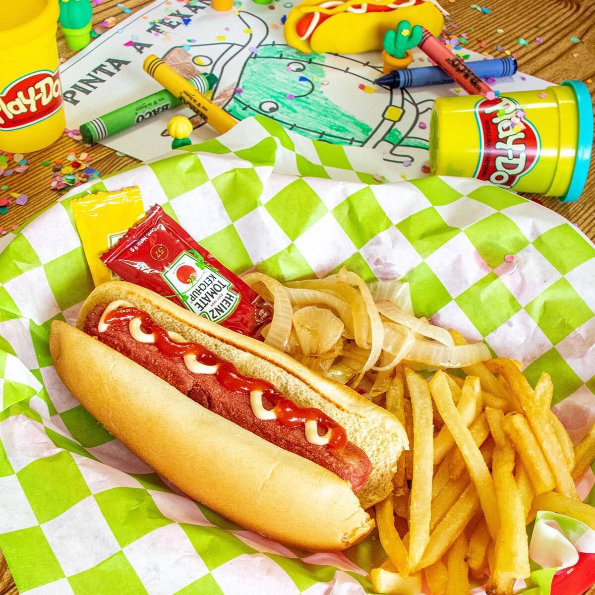 PAN PARA HOT DOG, SALCHICHA CHICA, PORCION DE PAPAS, MAYONESA, MOSTAZA CATSUP Y CHILE JALAPEÑO