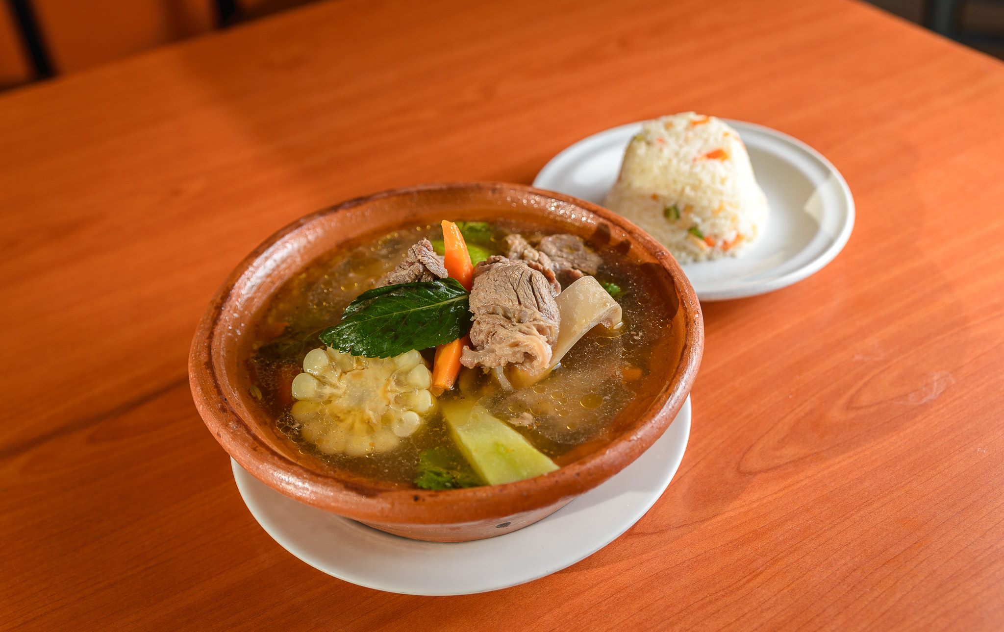 Costillas de res bañada en salsa picosita acompañadas de entrada del día, agua fresca de frutas, tortillas, salsa.