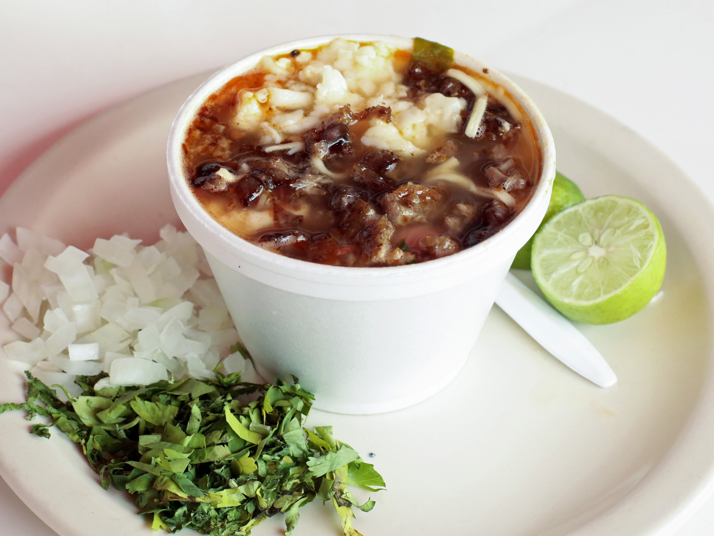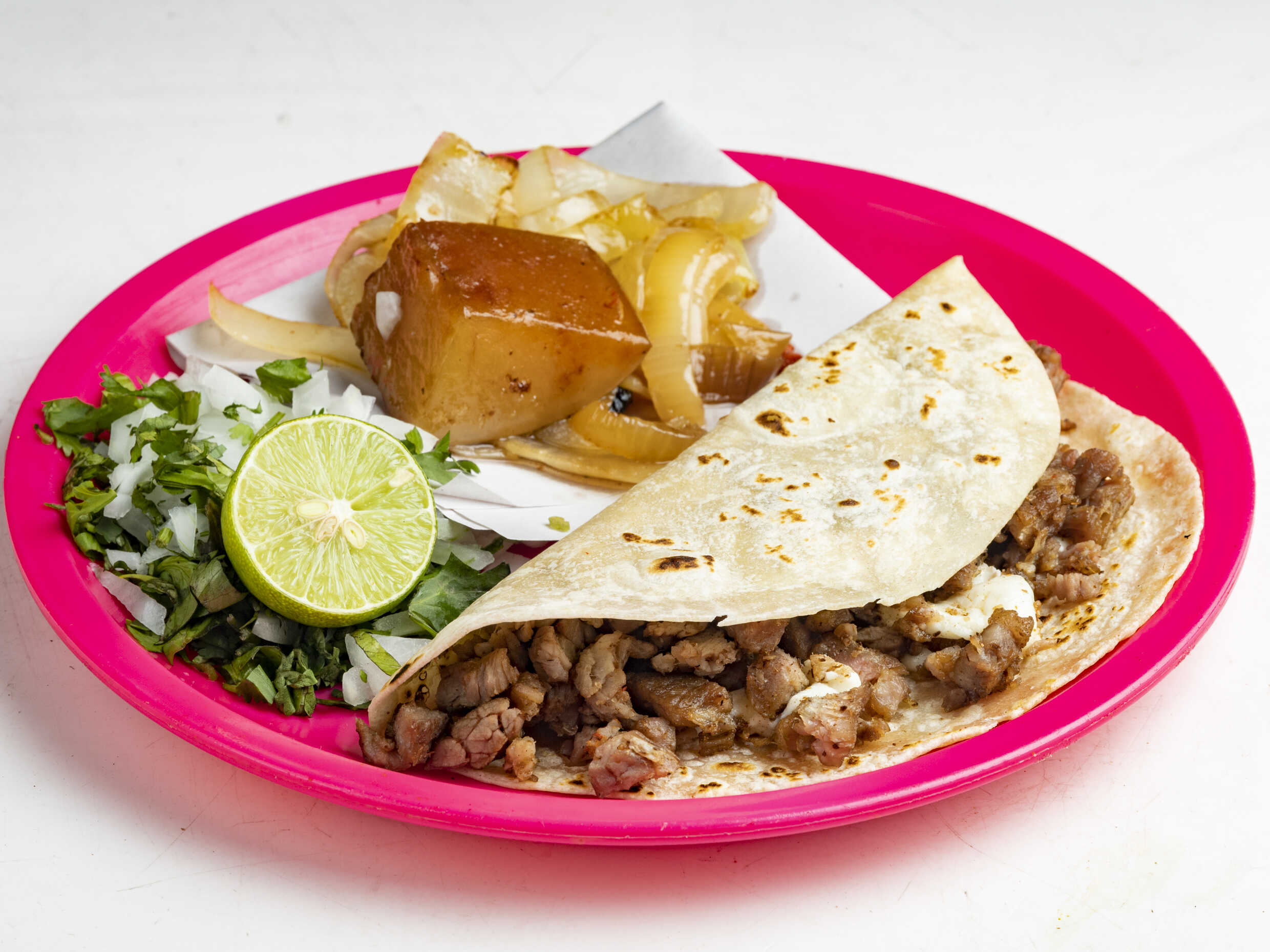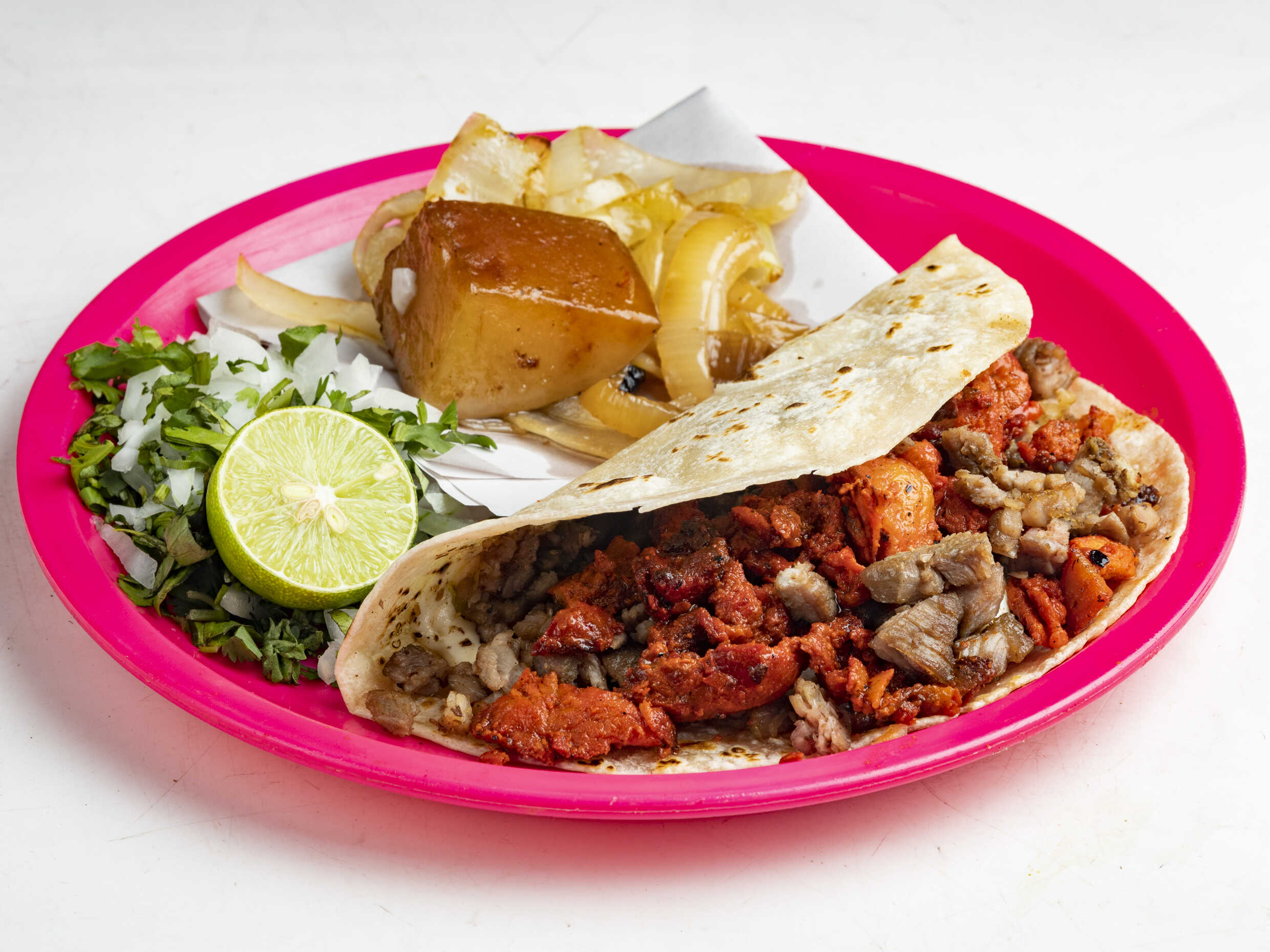 Cebolla, cilantro, cebolla asada, limón, salsa verde y roja.