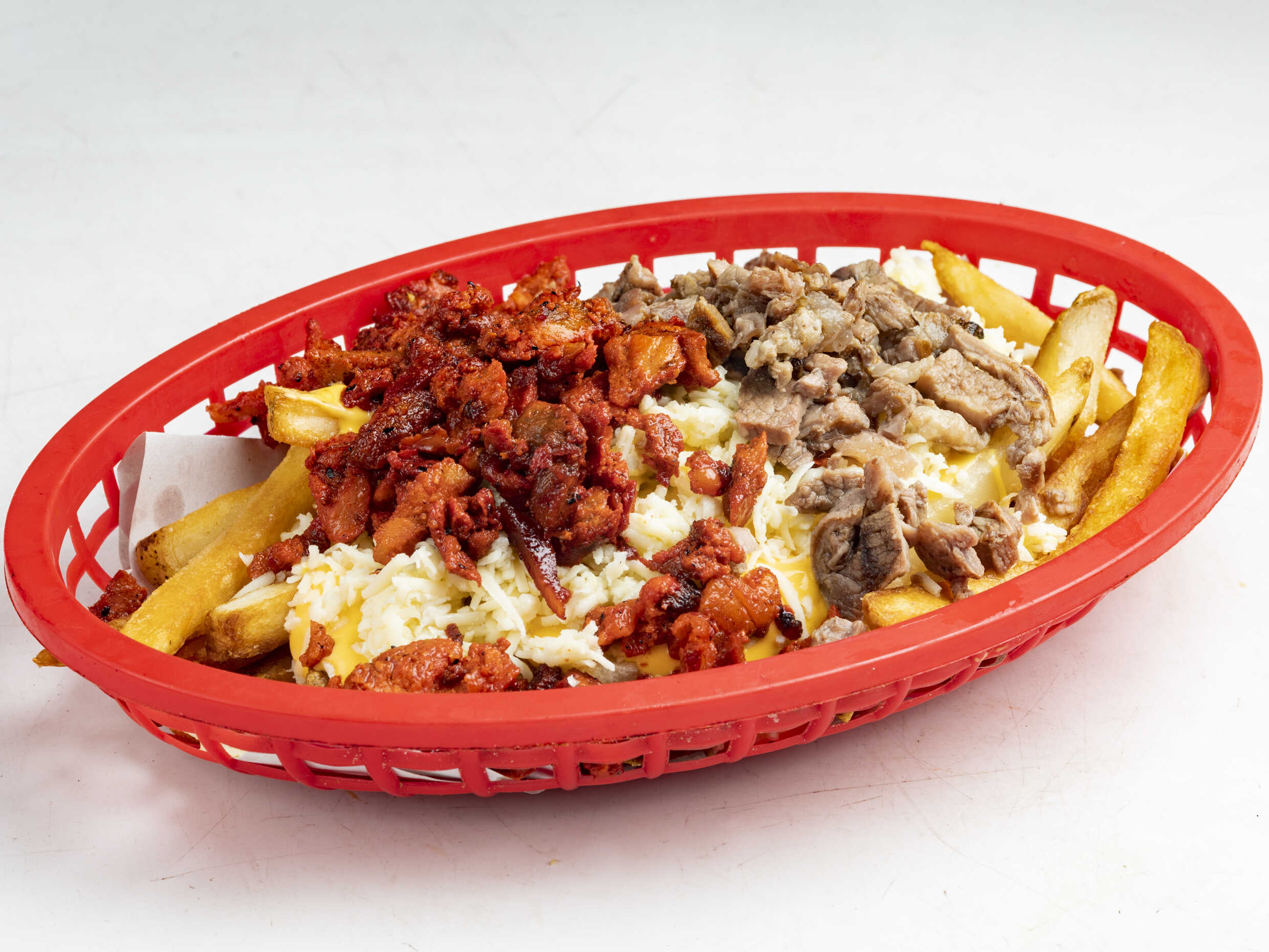 Lechuga, tomate, cebolla, papas marinadas queso Oaxaca y carne de res asada ( 45 gramos de carne por porción).