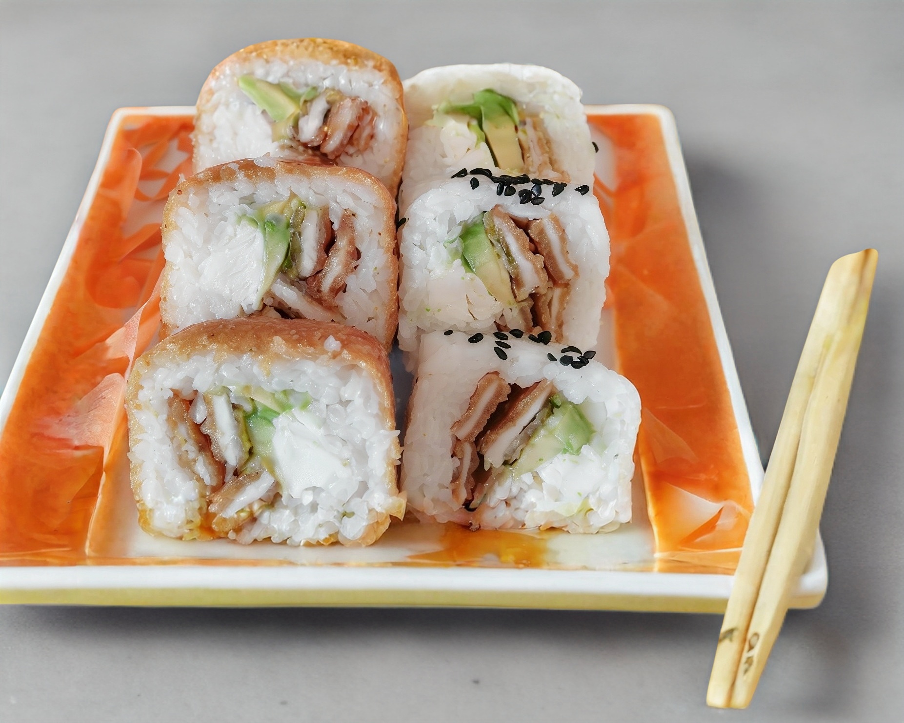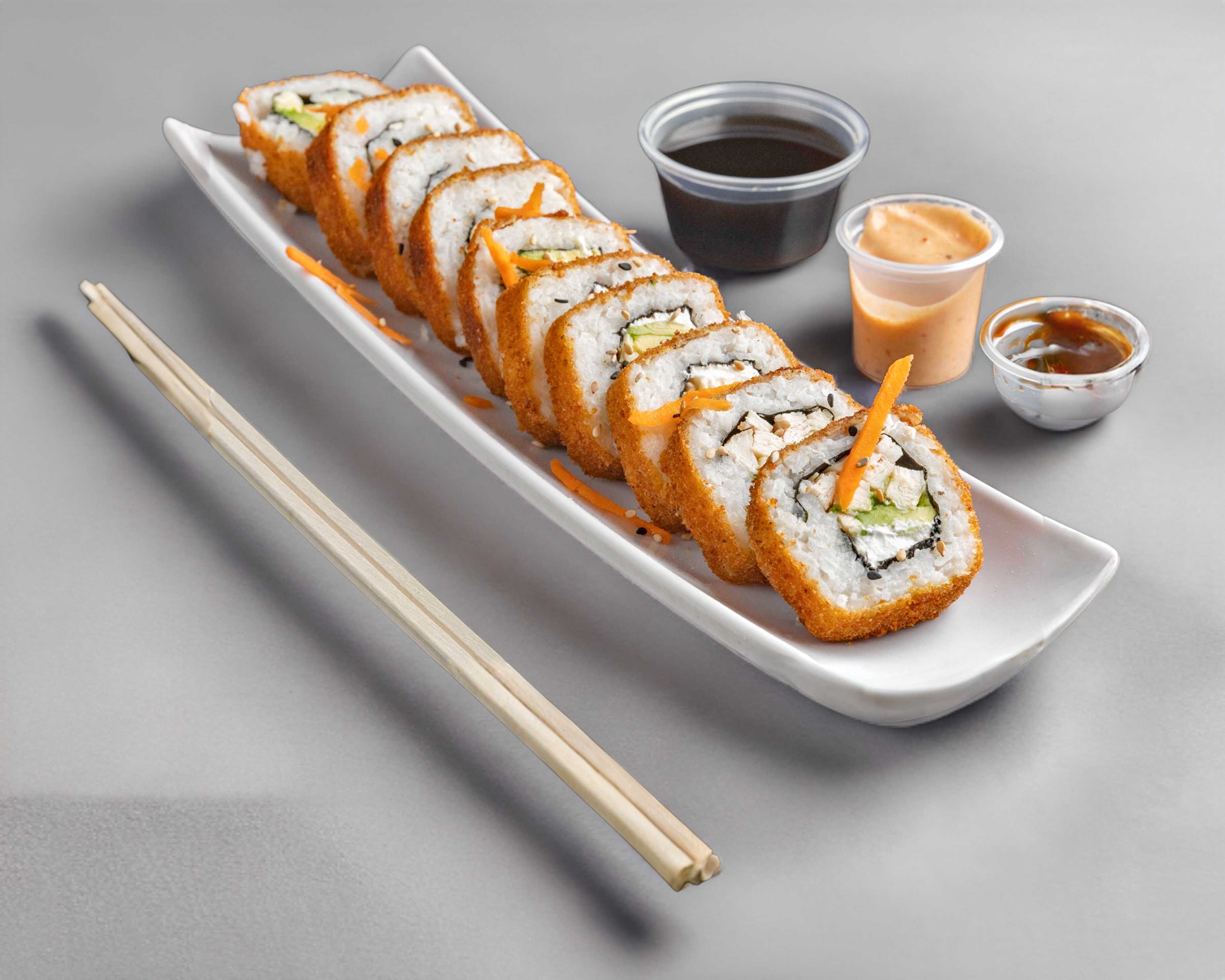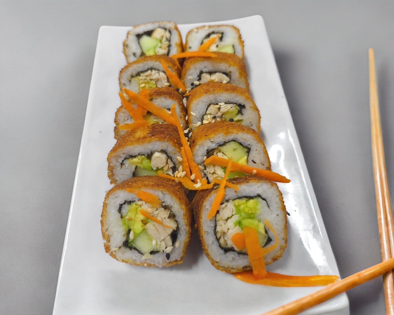 Rollo frio o empanizado sin alga relleno de pollo empanizado, aguacate y queso crema.