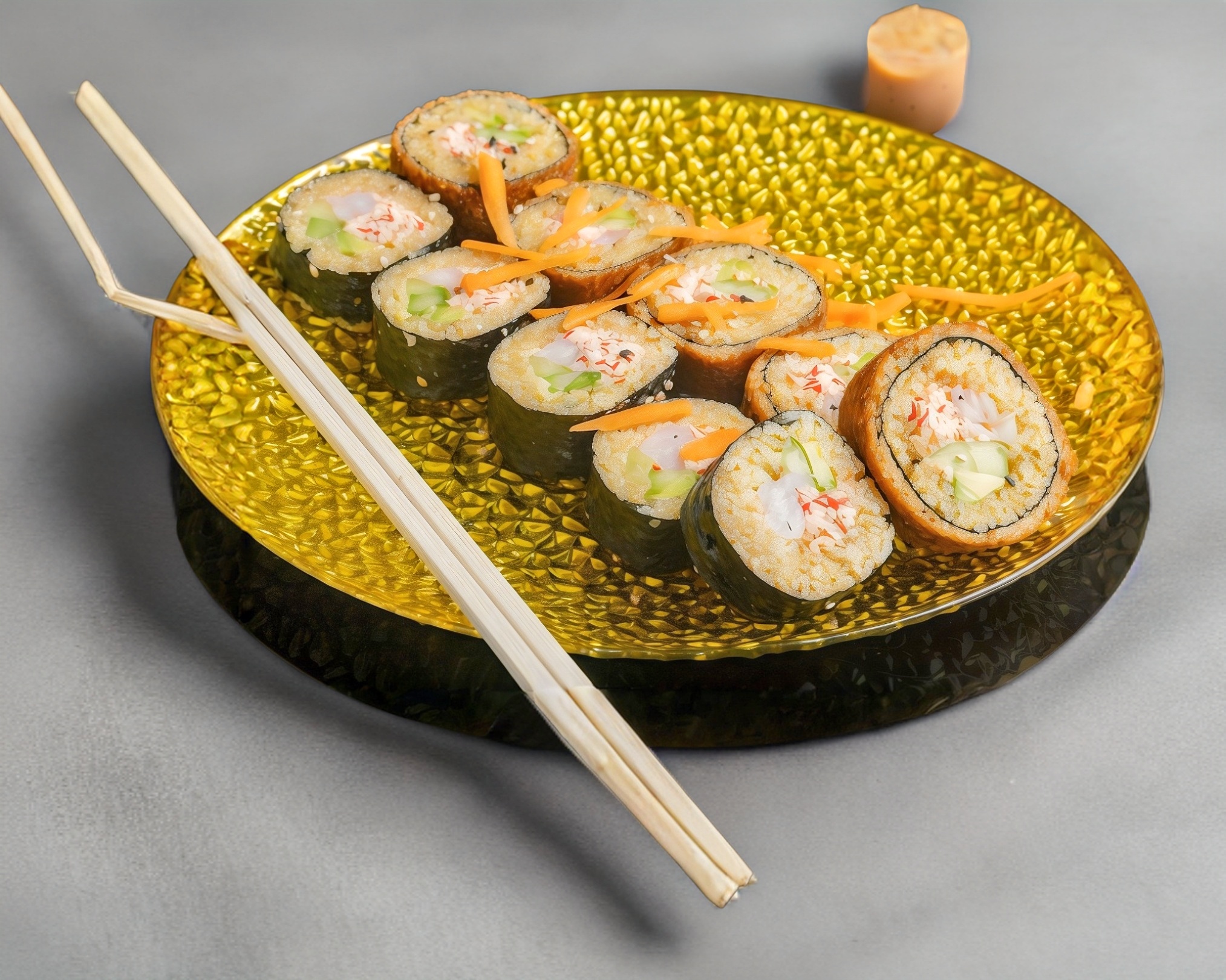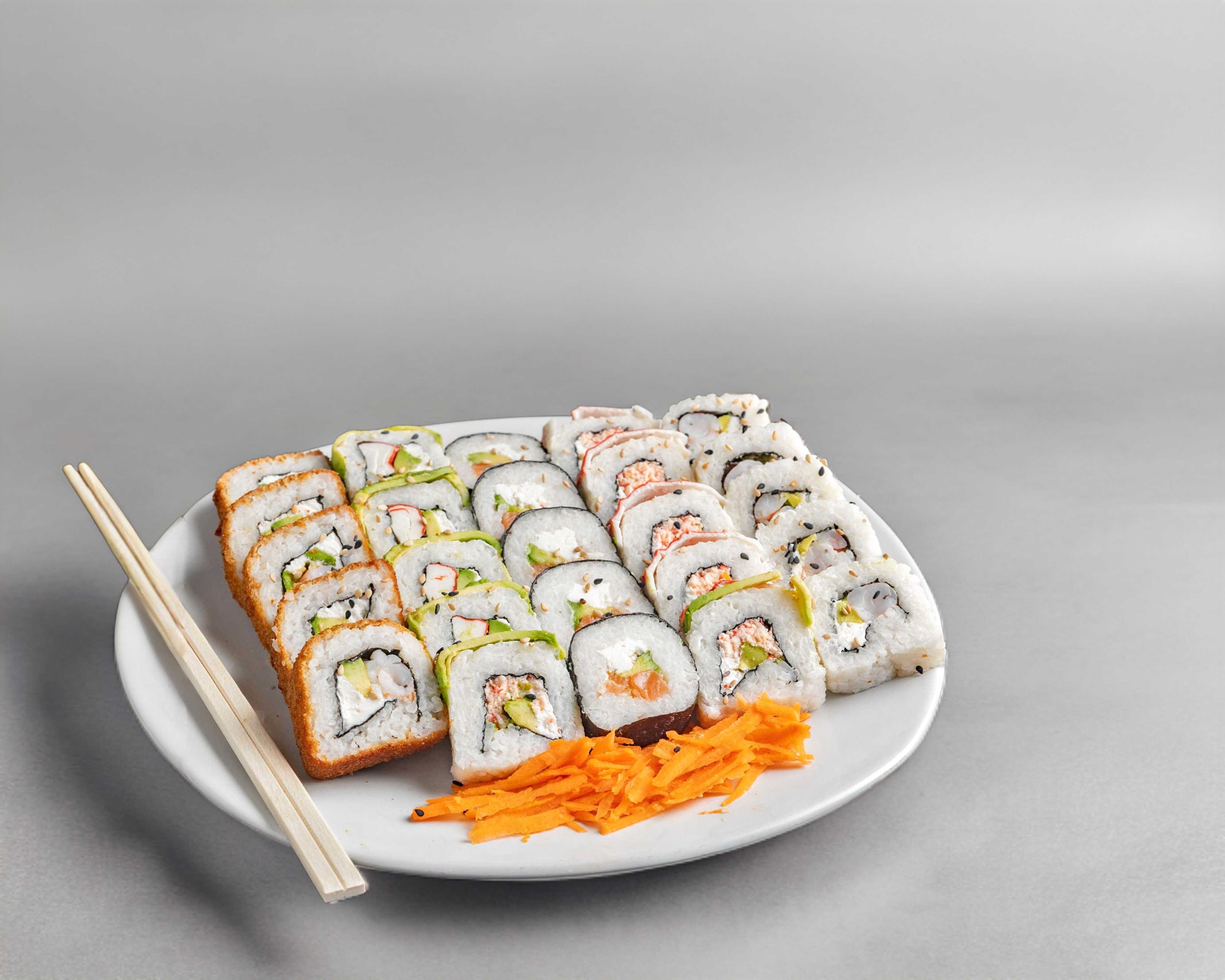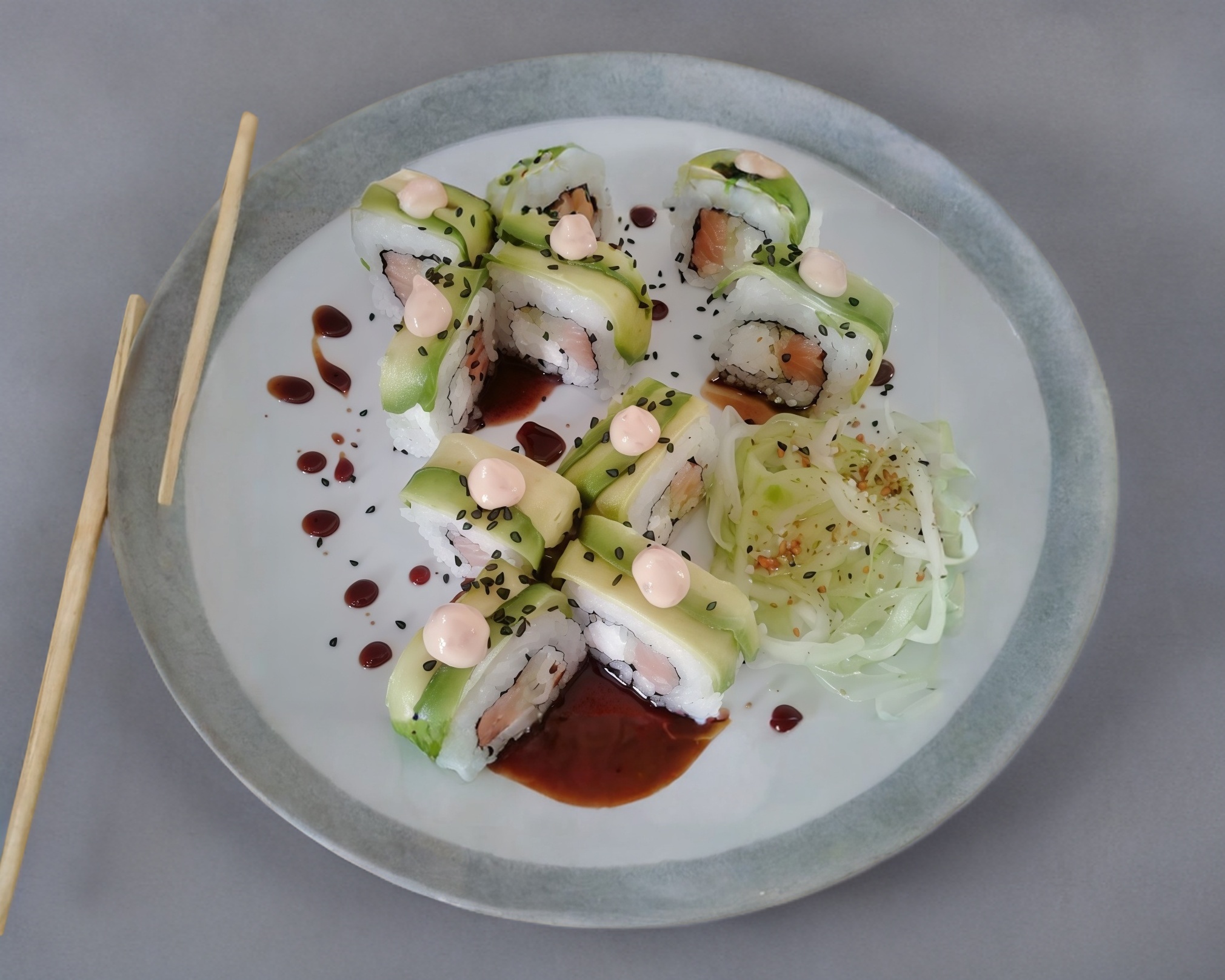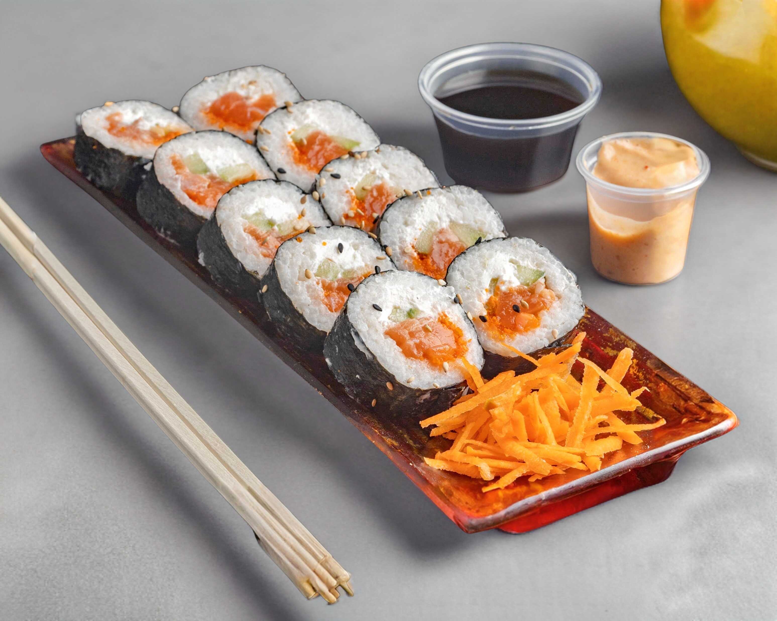 2 Rollos de sushi (10 bocados cada uno) rellenos de aguacate, pepino y proteína a elegir.