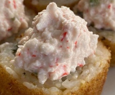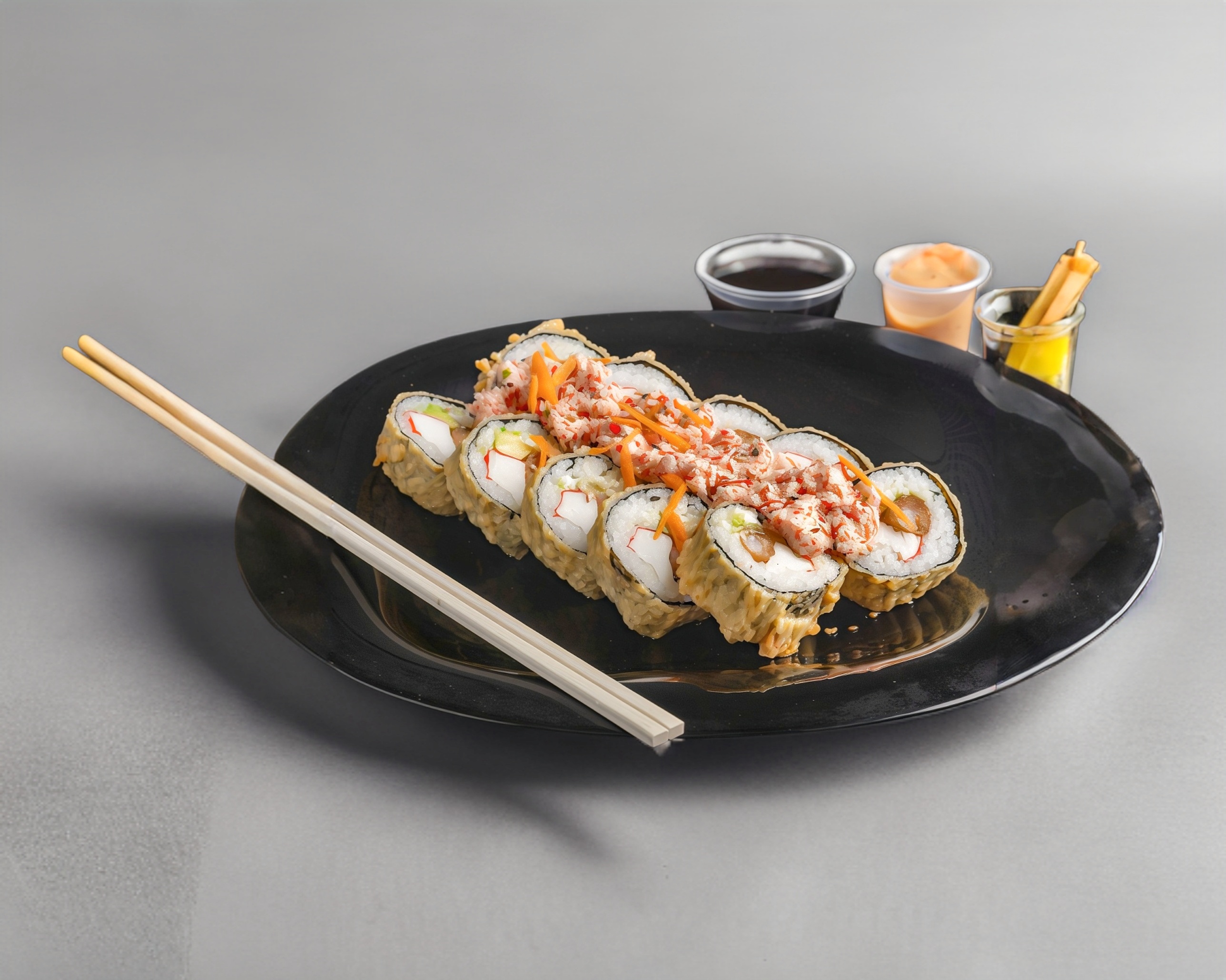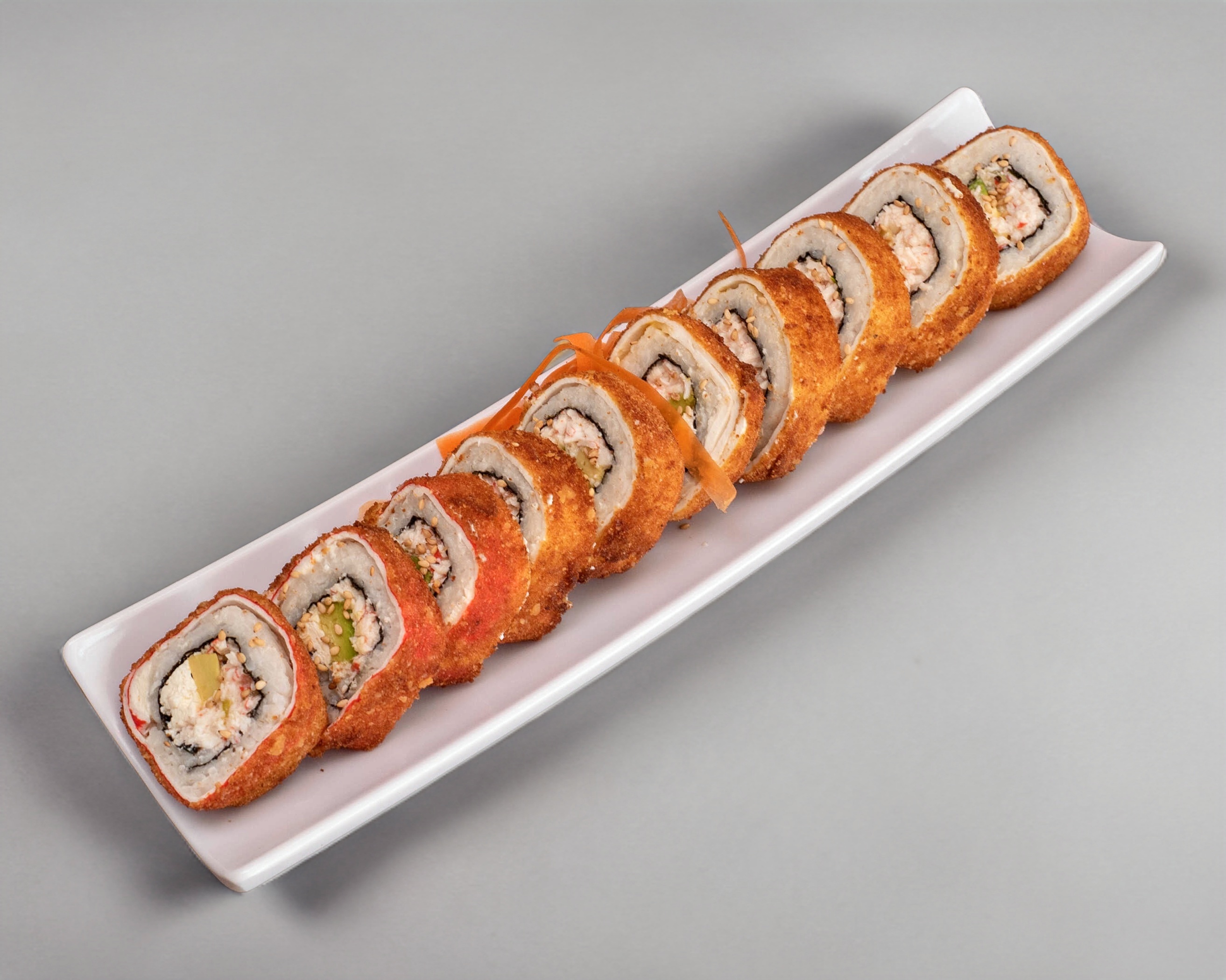 Rollo frio cubierto de camarón empanizado, relleno de surimi, aguacate y queso crema.