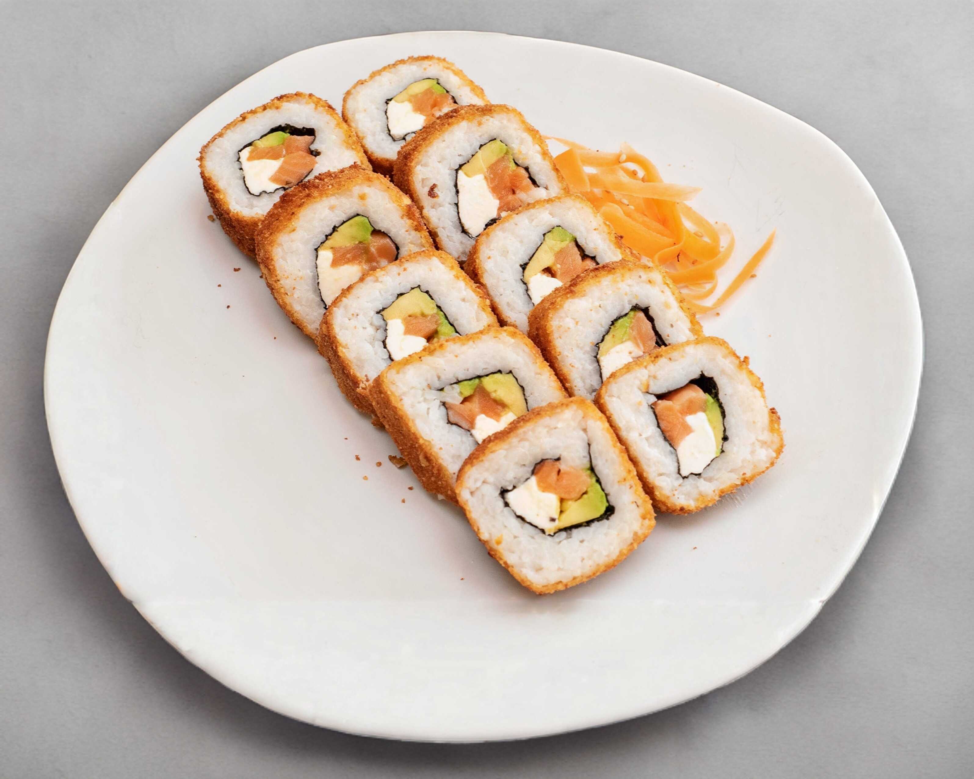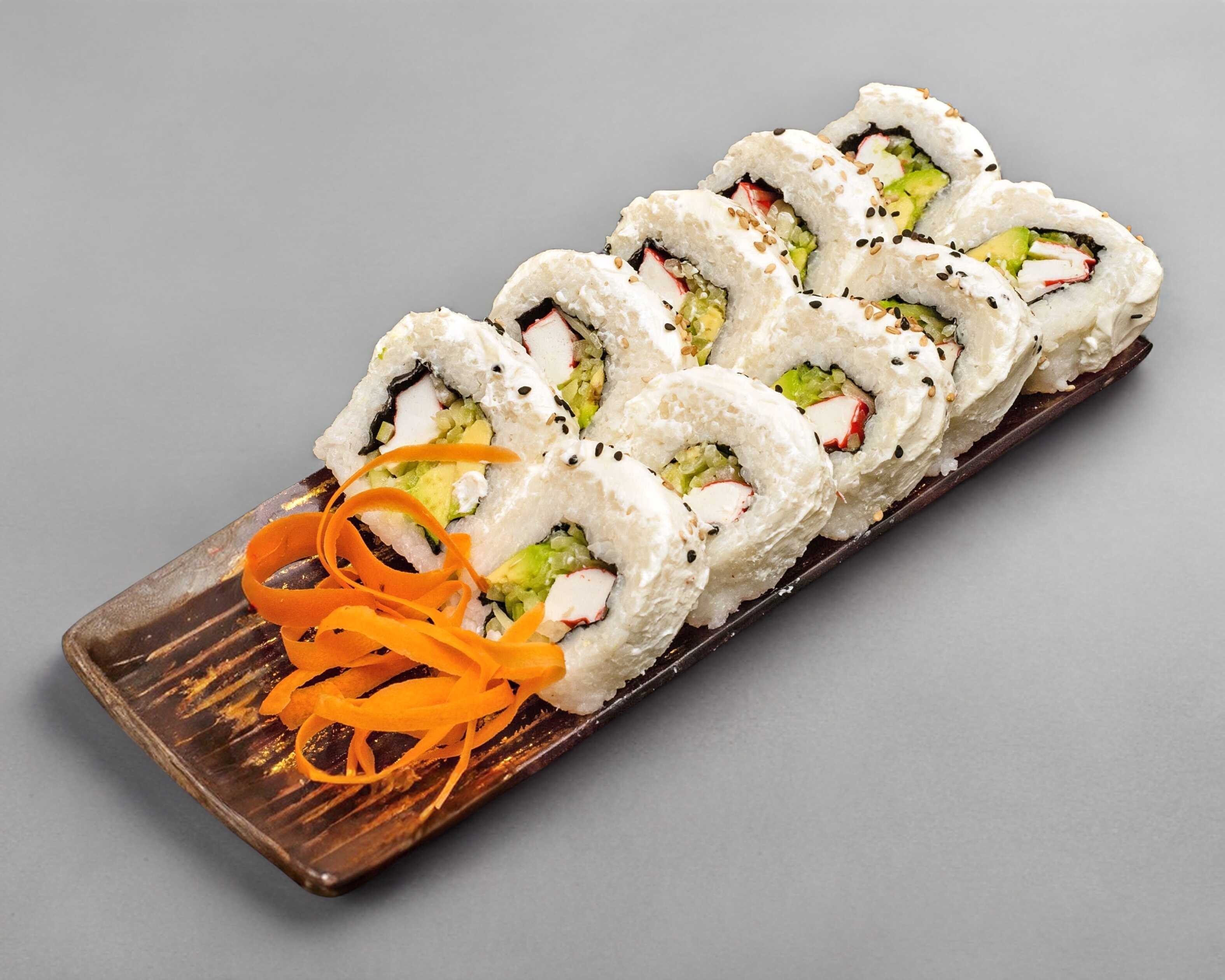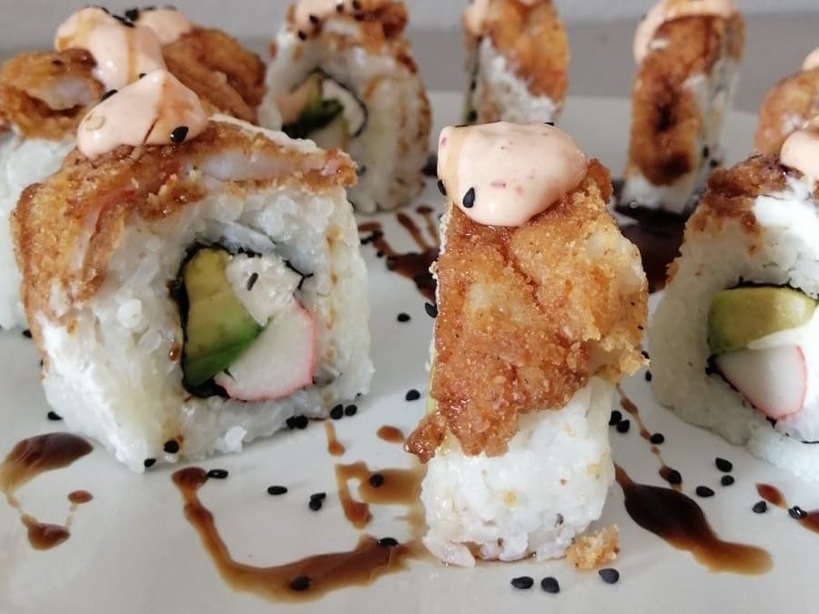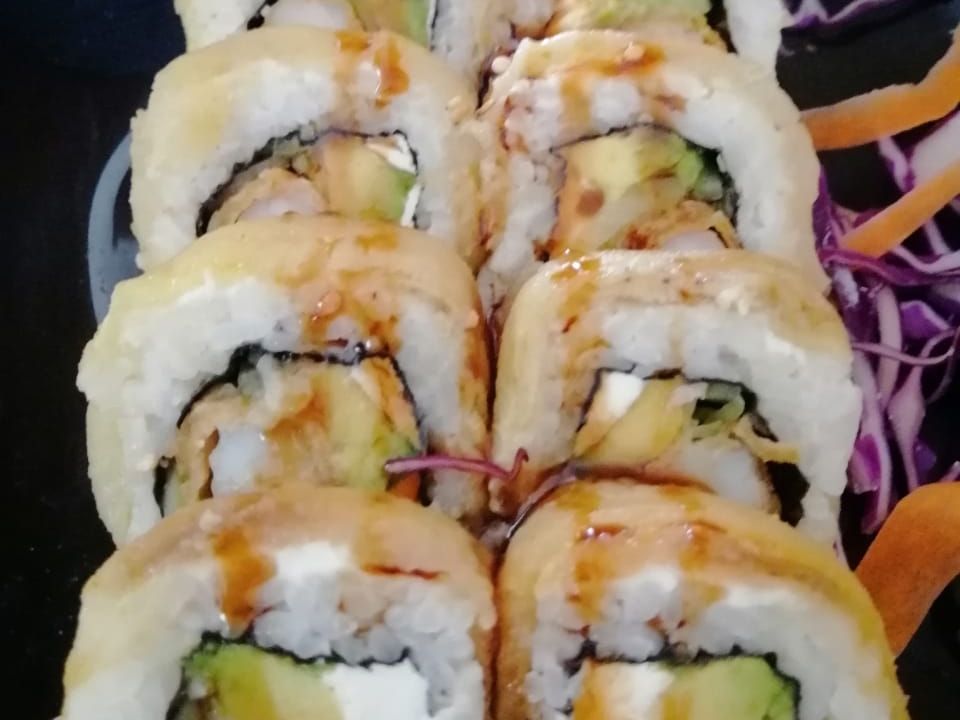 Rollo capeado relleno de camarón empanizado, surimi, aguacate y queso crema.