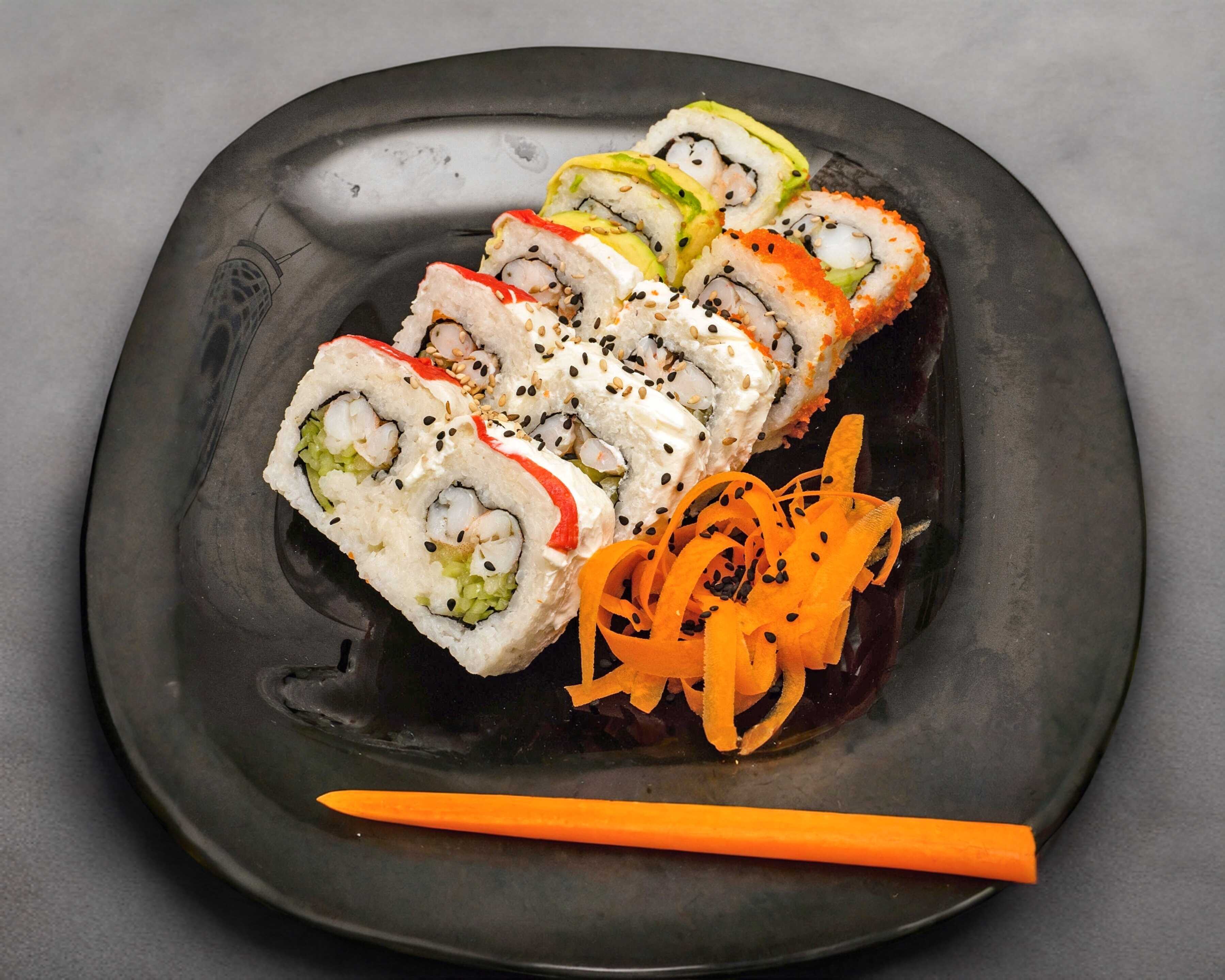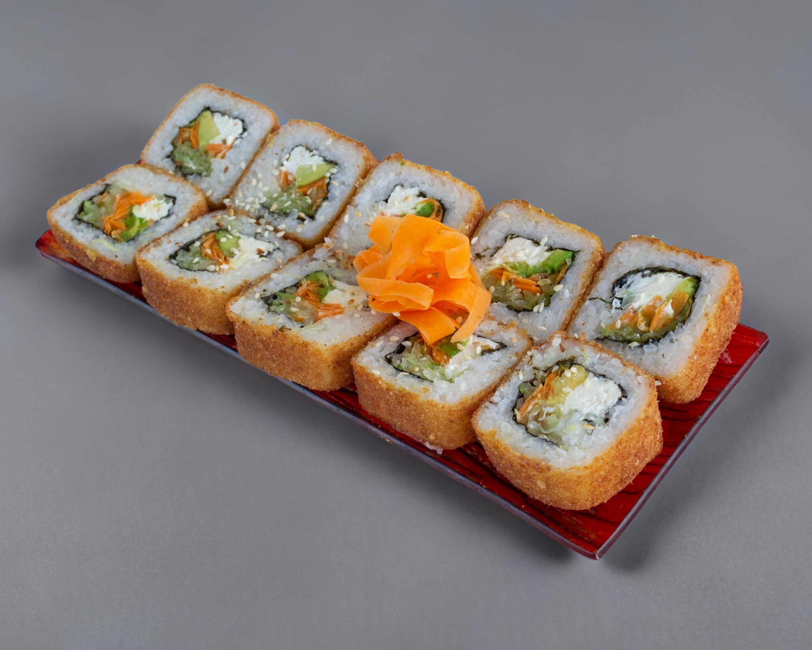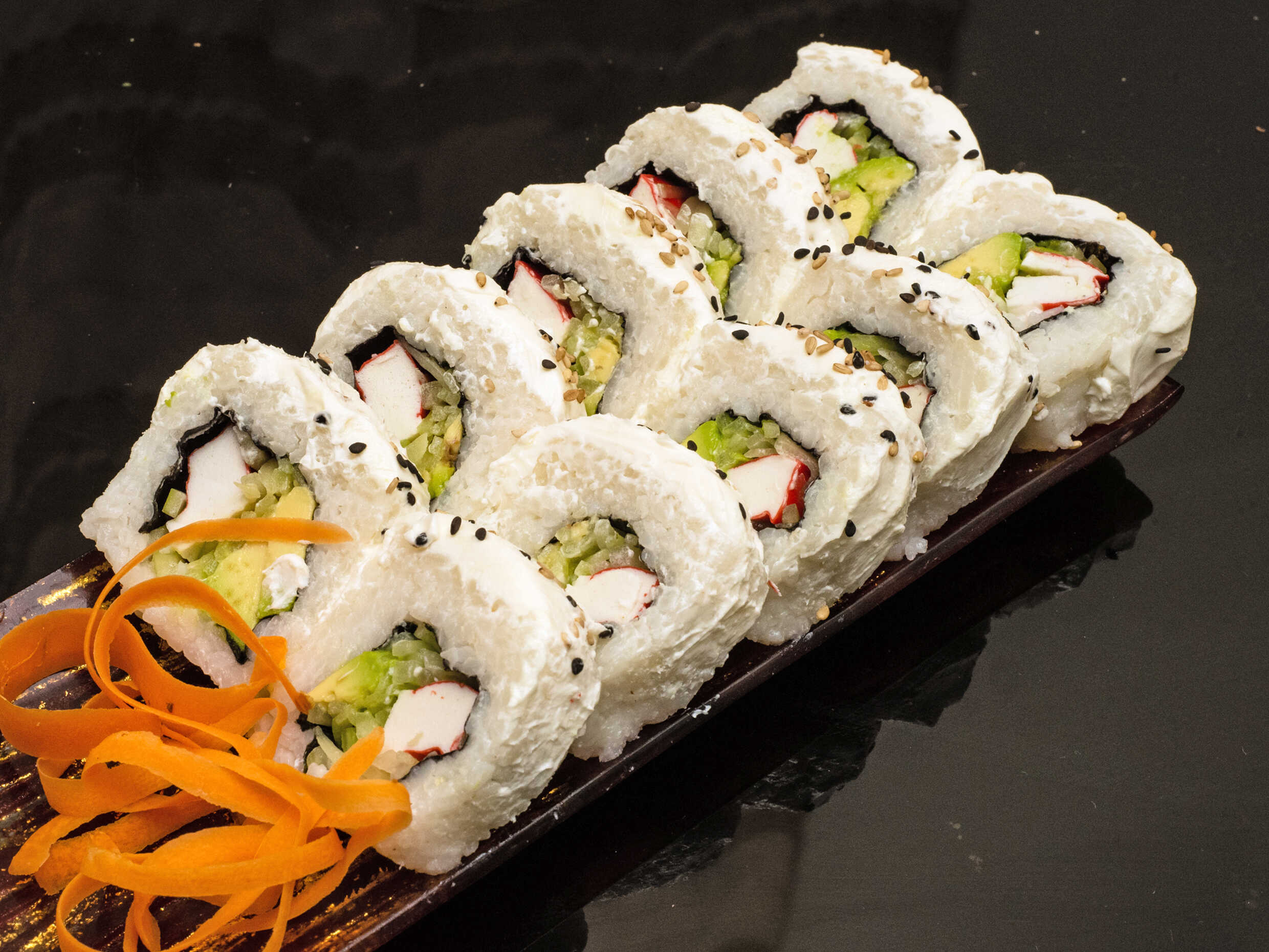 Rollo capeado relleno de camarón empanizado, surimi, aguacate y queso crema.
