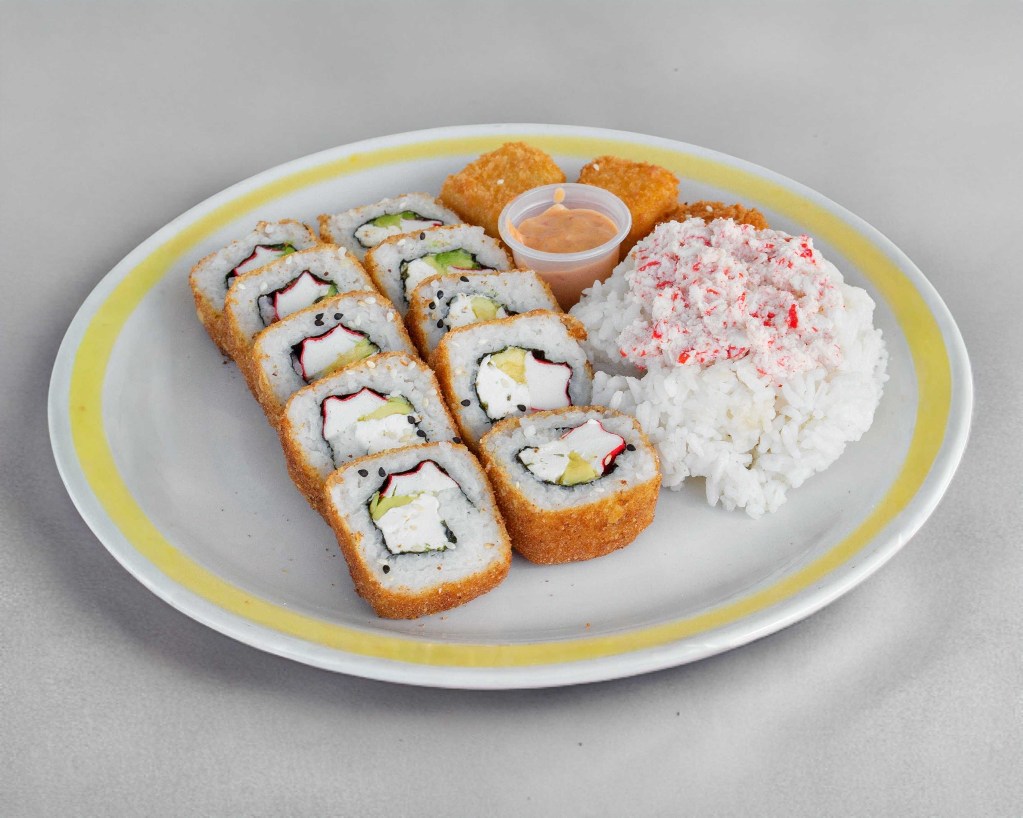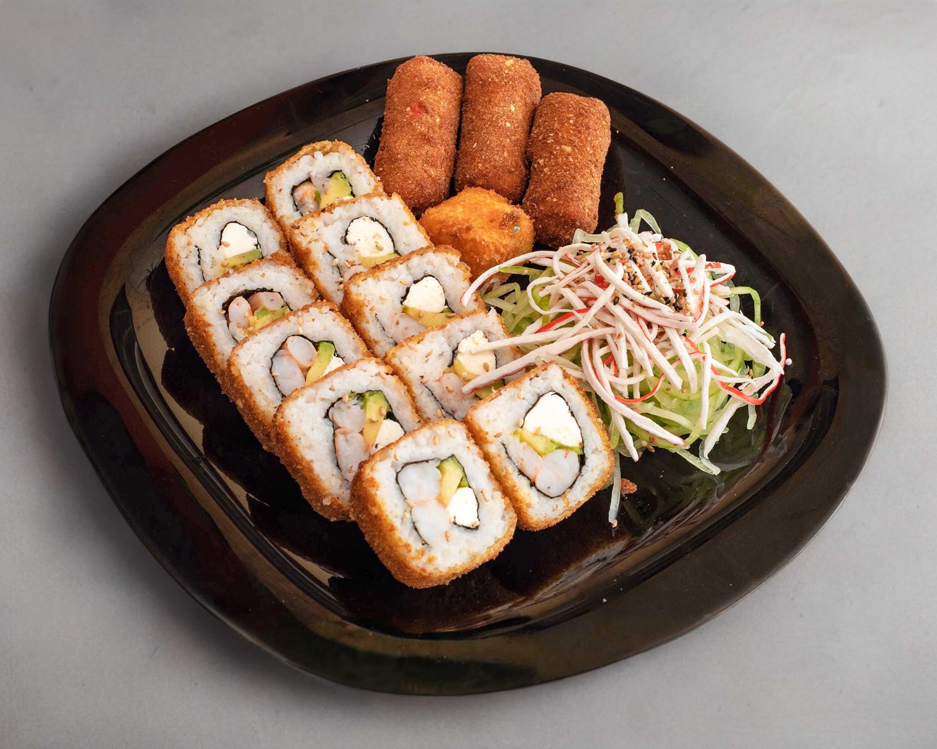 1 Rollo búfalo chicken roll, 1 eby roll empanizado, 1 california roll frio con pasta tampico, 1 rollo mitad camarón mitad tampico cubierto de aguacate y surimi, 1 orden de kushiages de queso, 1 orden de verduras empanizadas, una porción de arroz frito con verduras con salsas soya, dulce, chipotle y chiles toreados.