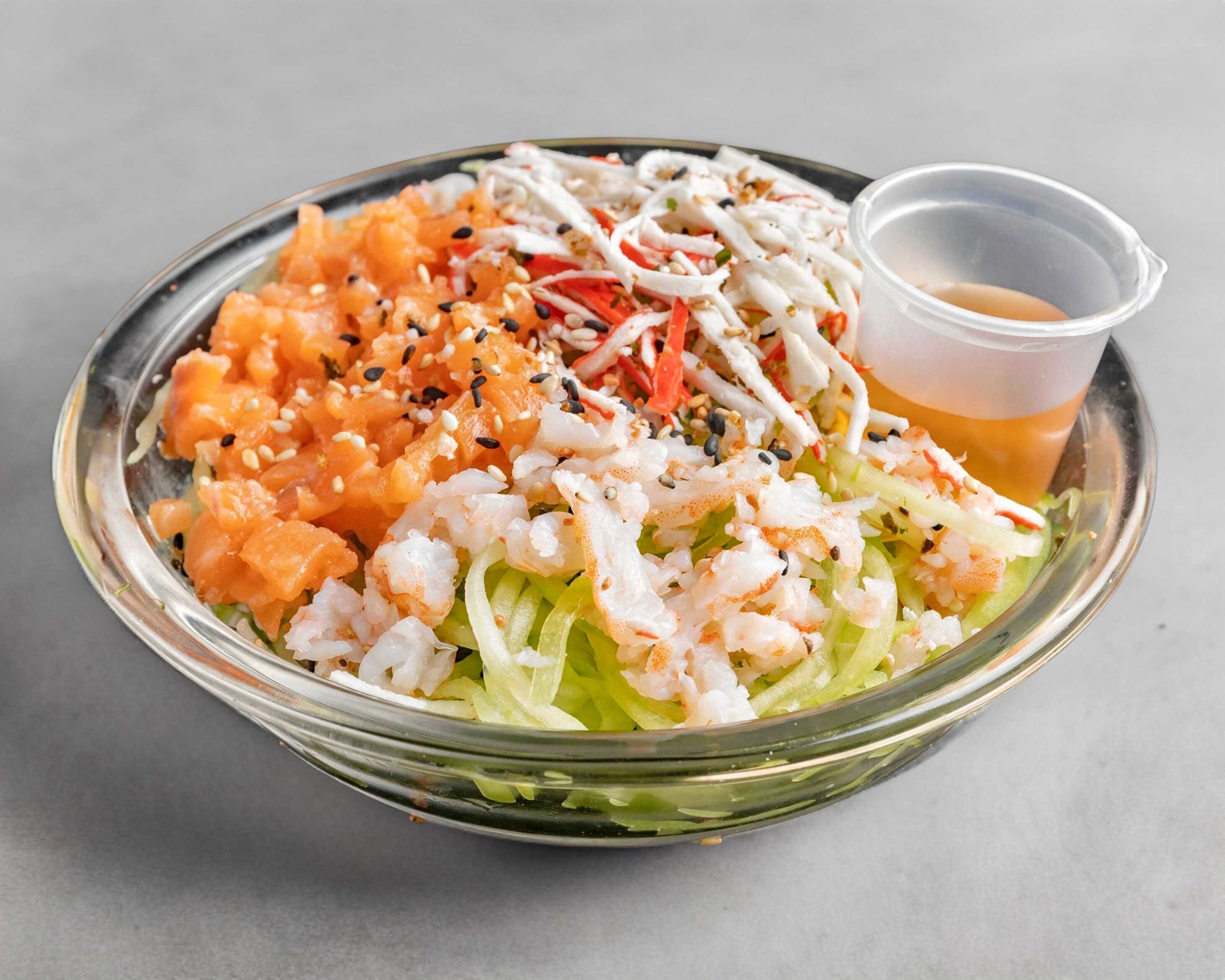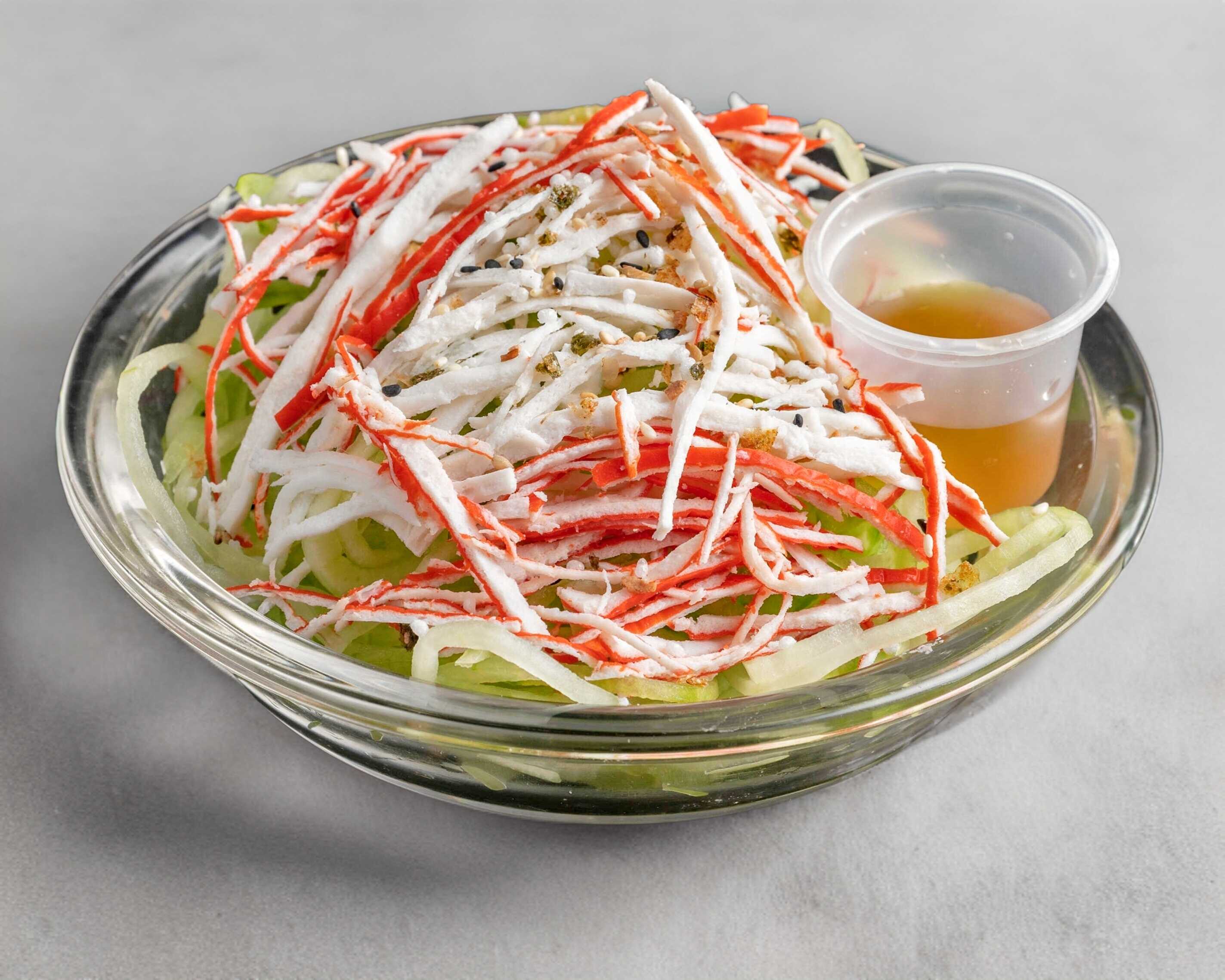 Ensalada a base de pepino con surimi, camarón, salmón, furikake y vinagre.