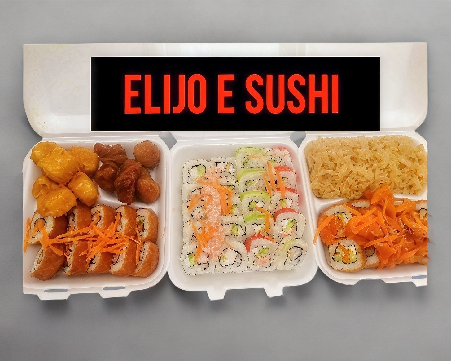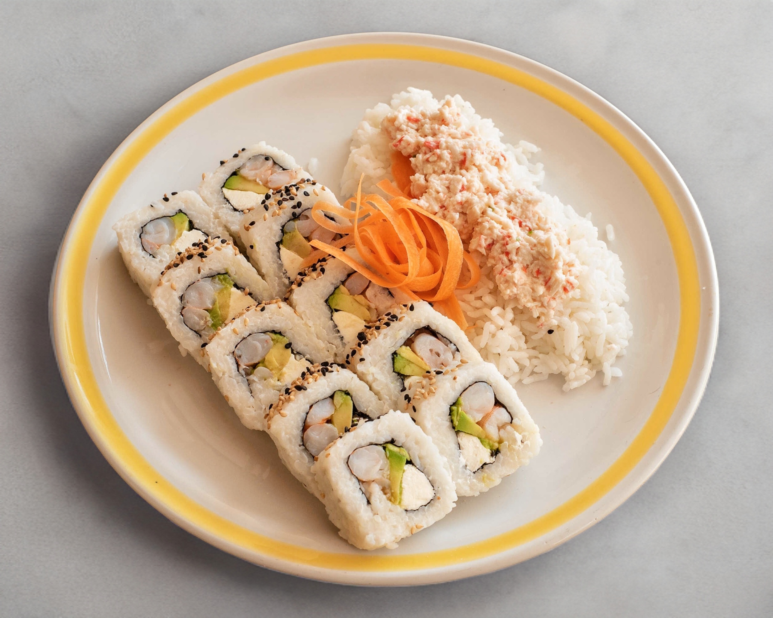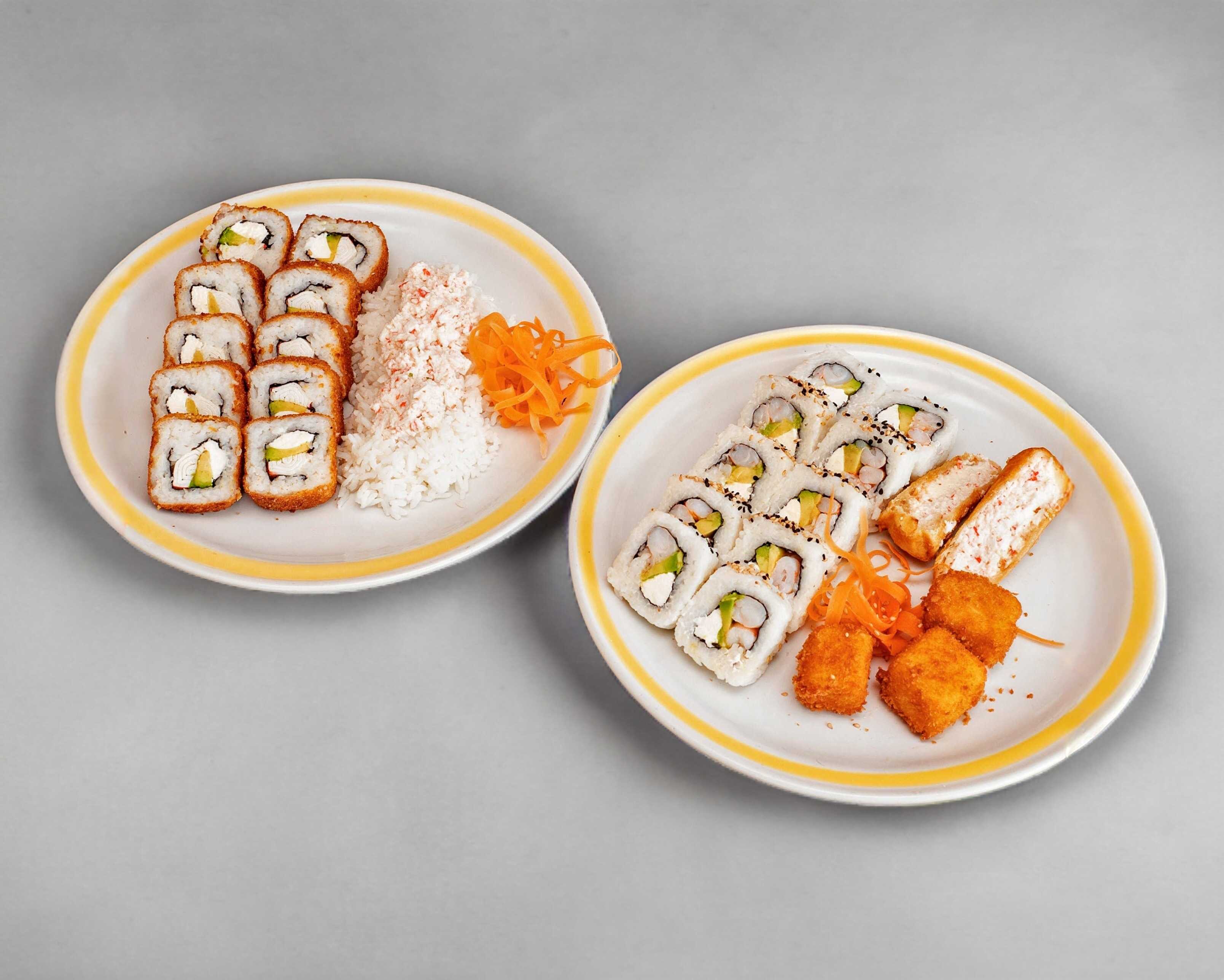 Camarón roll frio, california roll empanizado, arroz gohan con tampico, 3 kushiages, 1 egg roll y 2 refrescos. Además, incluye 2 salsa soya, 2 aderezo chipotle y 2 soya dulce.