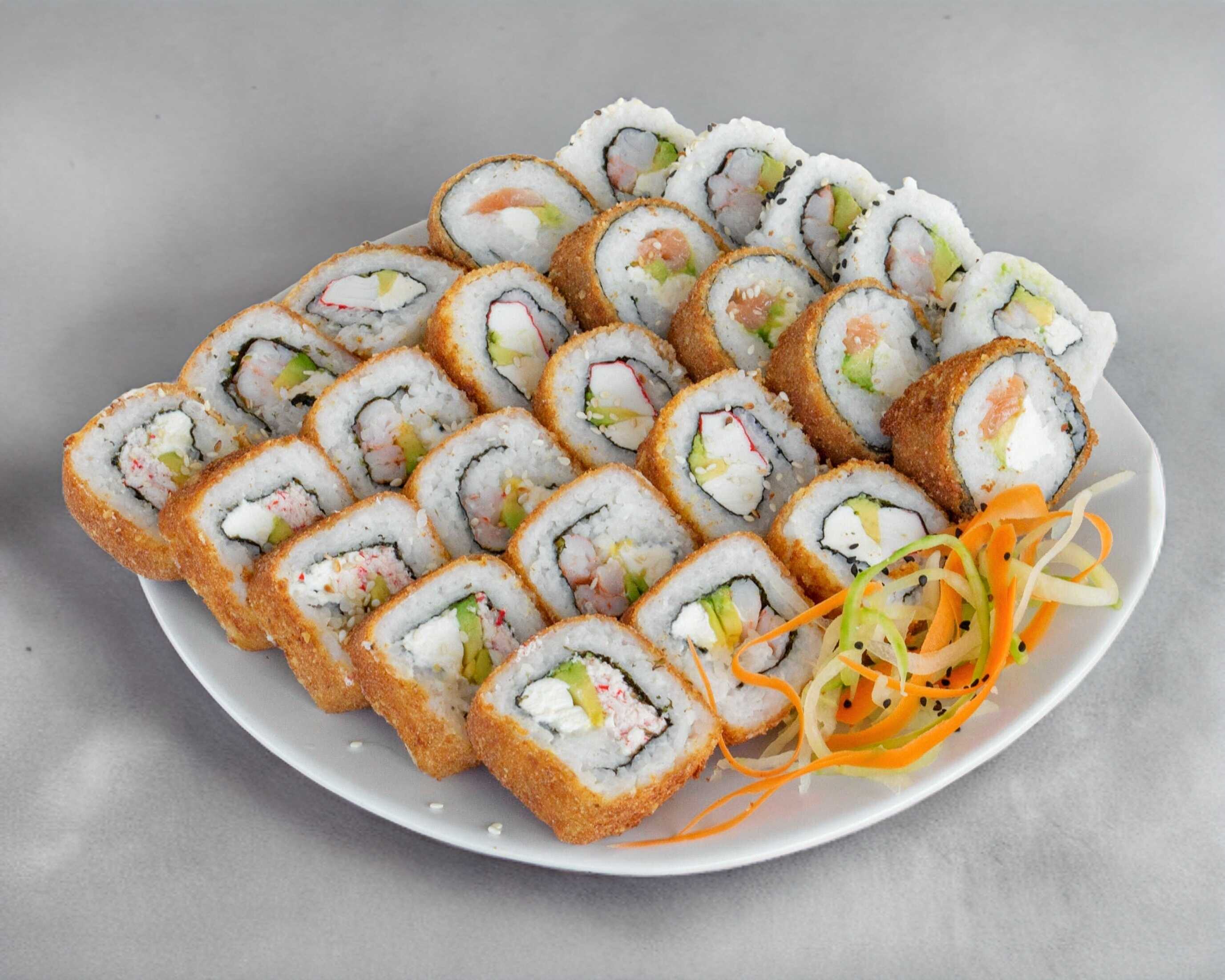 25 Bocados de sushi (5 empanizados de camarón, 5 frios de camarón, 5 frios de surimi, 5 frios de tampico y 5 frios de salmón), todos con queso crema, aguacate, llevan 2 salsas soyas, 2 aderezo chipotle, 2 salsa dulce y 1 chiles toreados.