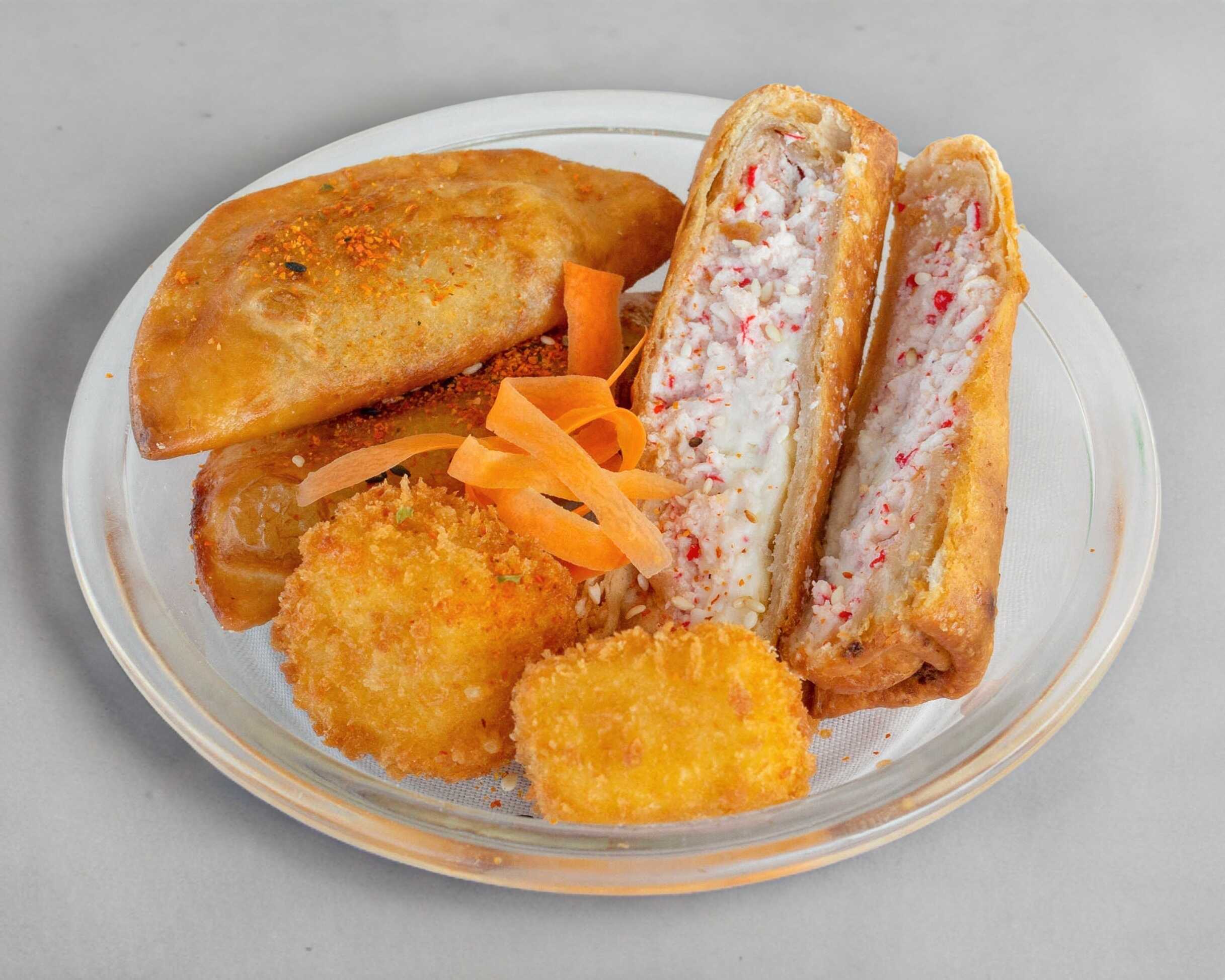 25 Bocados todos con queso crema y aguacate (5 camarón fritos, 5 camarón empanizados, 5 tampico empanizado, 5 surimi empanizados, 5 salmón empanizados), incluyen 2 salsas soya, 2 aderezo chipotle, 2 salsa dulce y 1 chiles toreados.