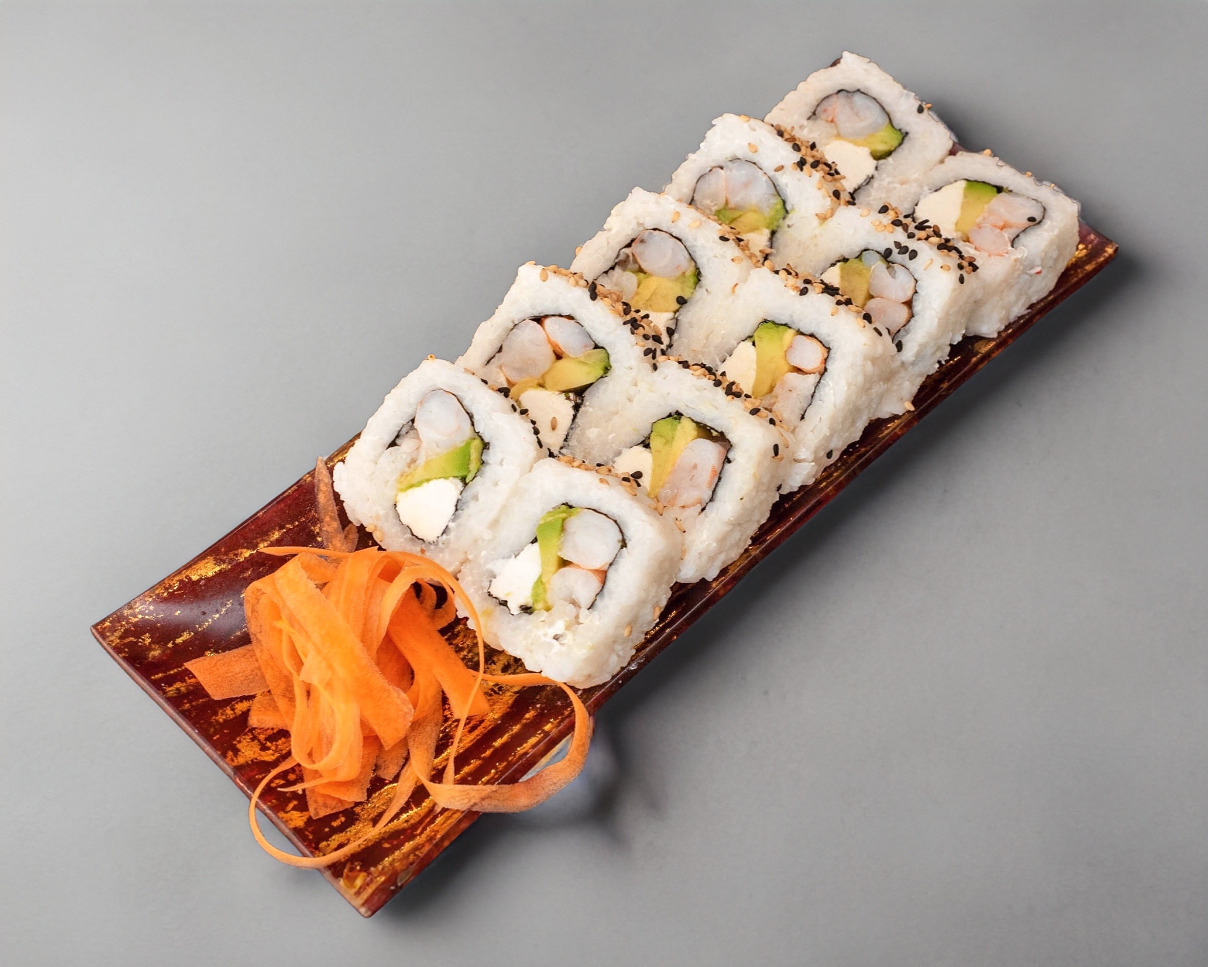 Rollo frío cubierto de queso crema, relleno de aguacate, pepino y marisco a elegir.