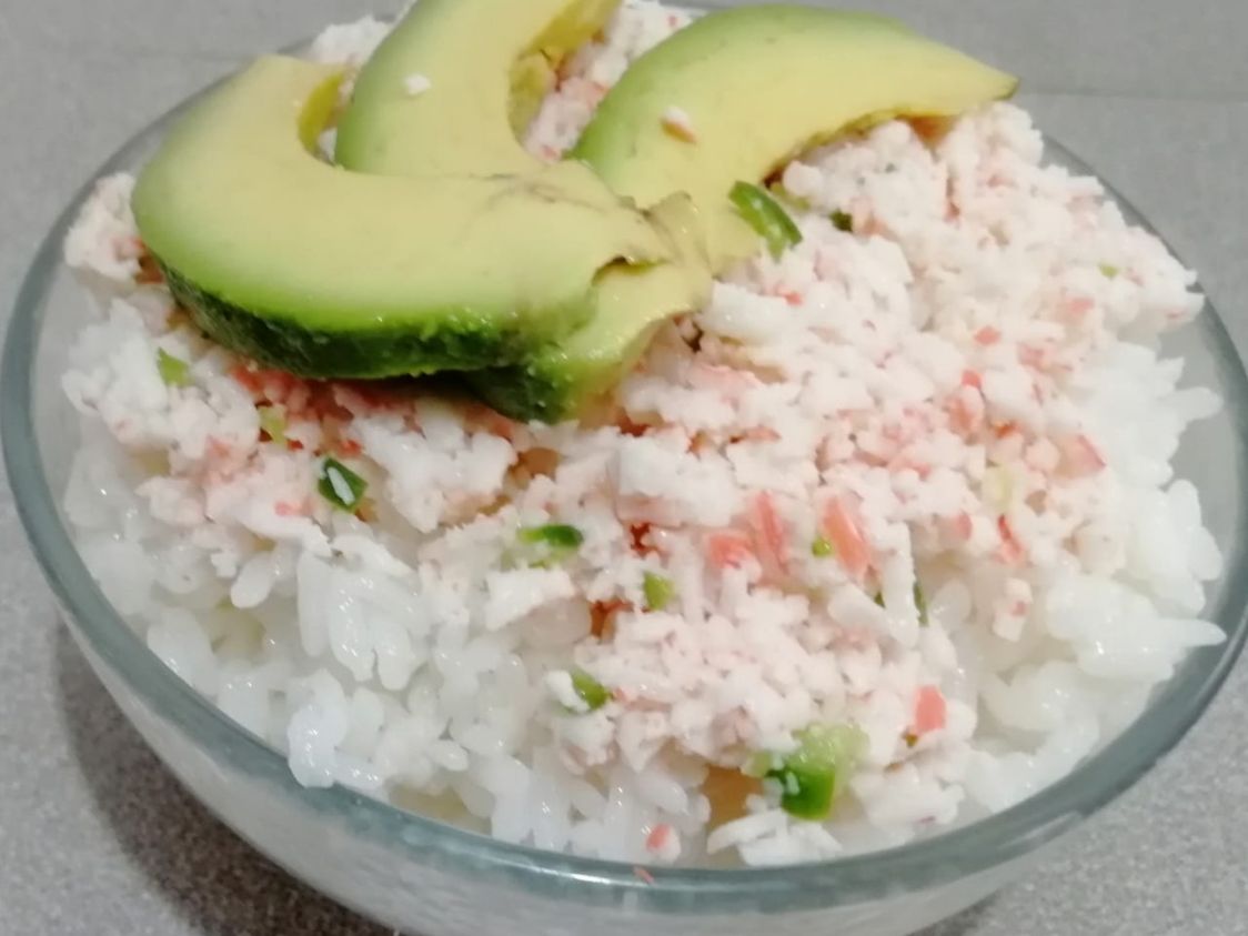 Arroz al vapor con aguacate, queso crema, tampico y furikake.