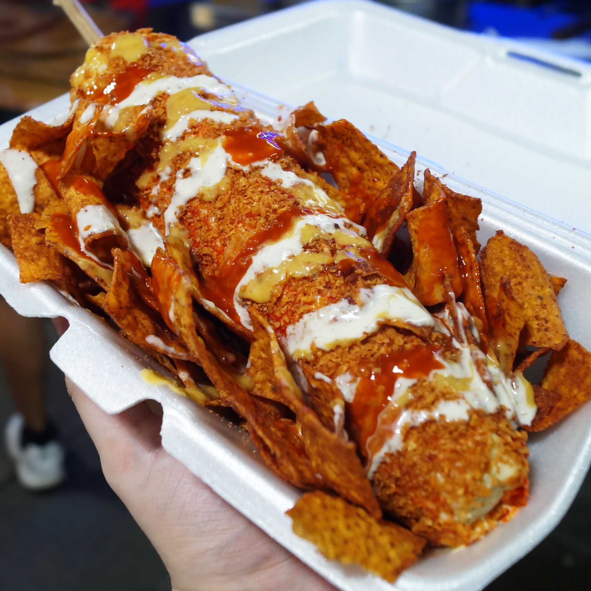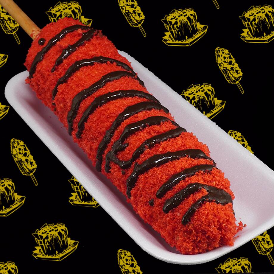 Elote entero empanizado en Cheetos Flamin´ Hot, más tus aderezos favoritos.