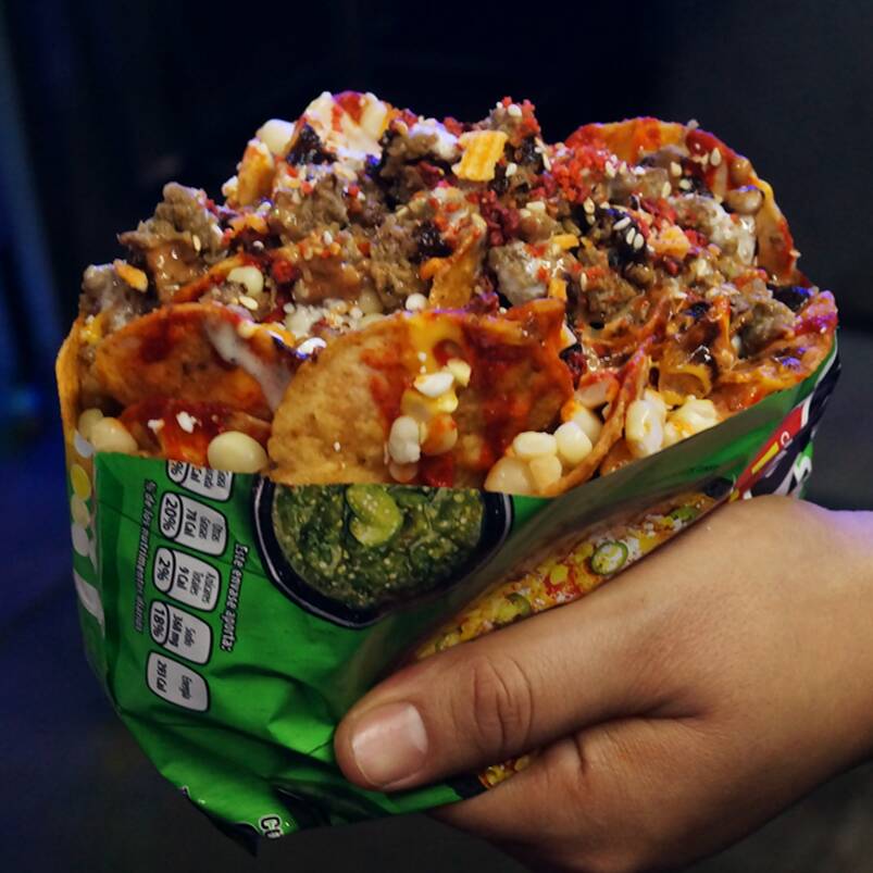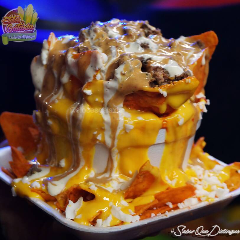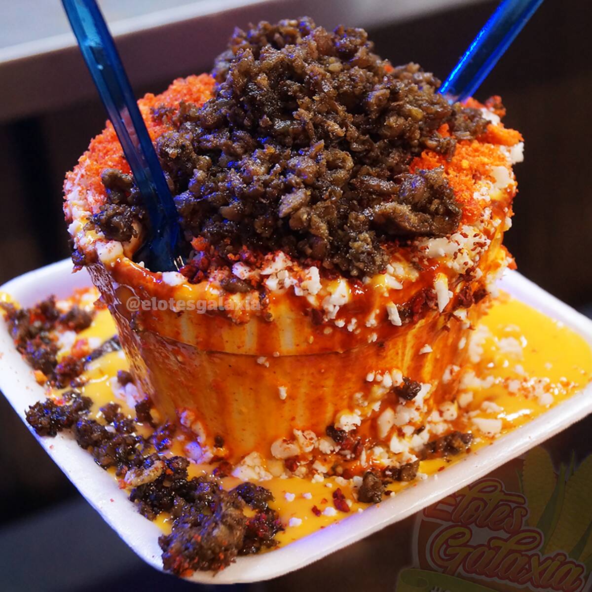 Para un antojo salvaje: medio litro de elote acompañado de carne asada recién hecha más una bolsa de papas favoritas con mucho queso, toppings y aderezos.