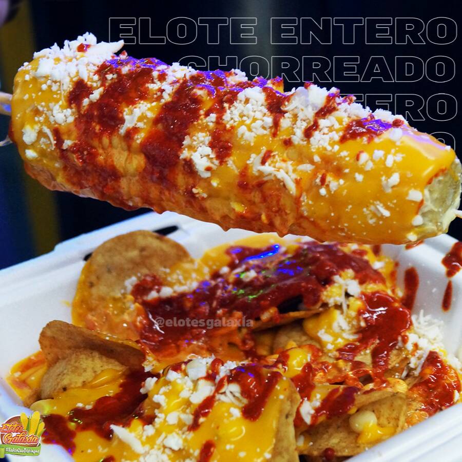 Un rico elote entero acompañado de una bolsa de papitas a tu elección y elote desgranado con queso, toppings y aderezos.