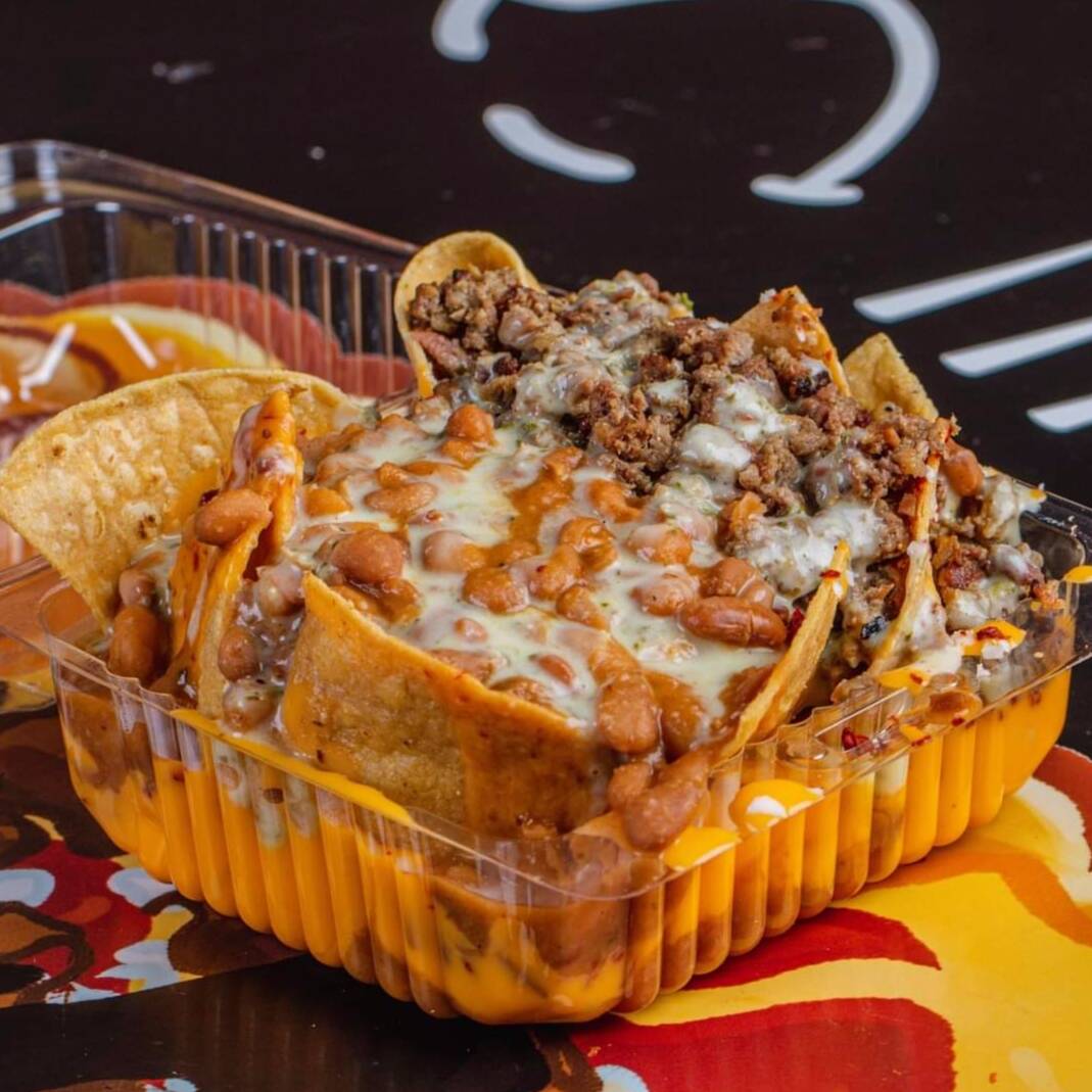 CRUJIENTES TOTOPOS BAÑADOS EN QUESO AMARILLO, ACOMPAÑADOS DE FRIJOLES CHILLIS Y CARNE ASADA; COMPLEMENTA CON ADEREZO DE AGUACATE-CILANTRO,QUESO BLANCO Y TOPPING DE TOCINO