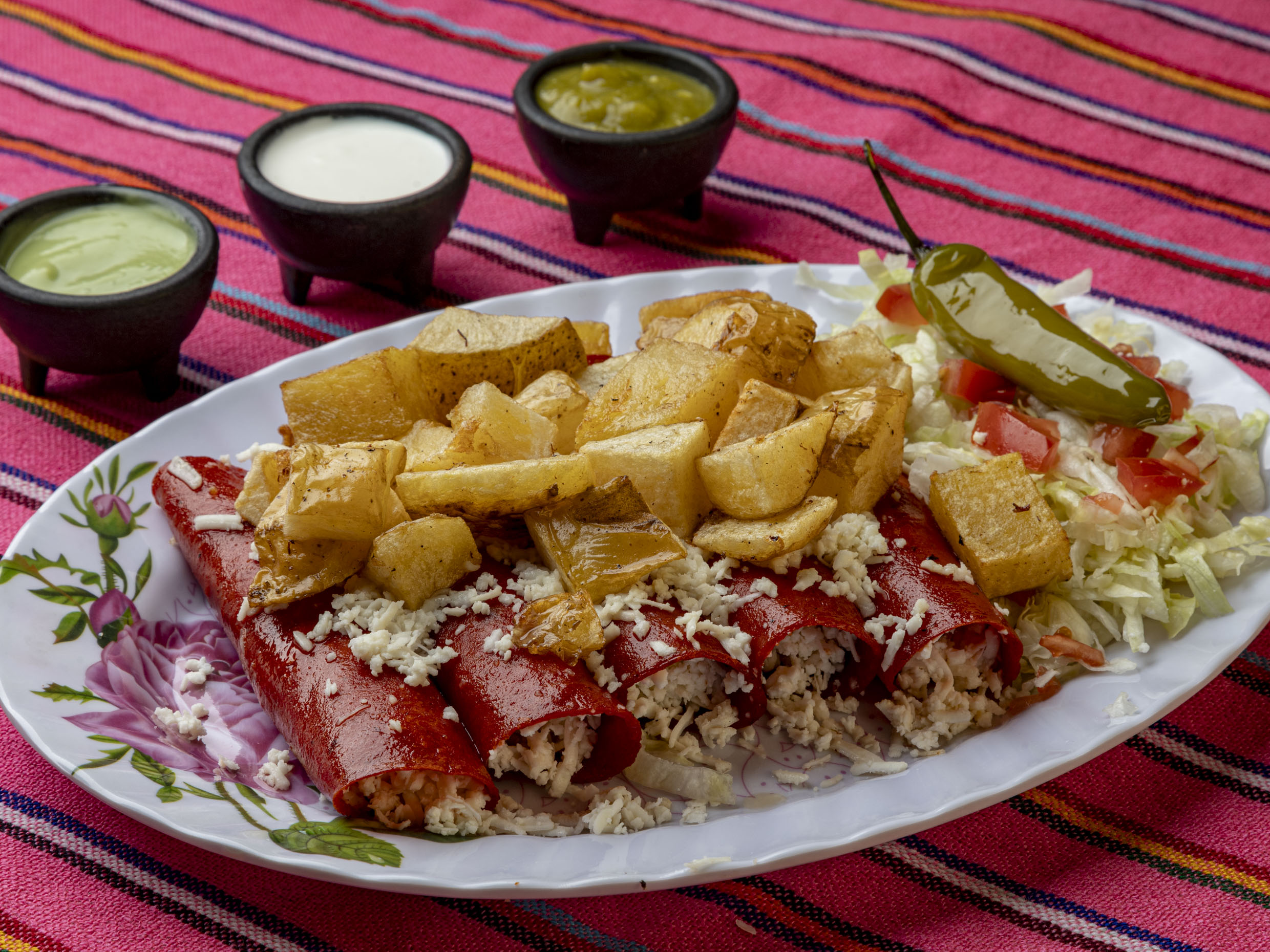 Orden 4 Piezas, en tortilla roja con Chile ancho, rico queso Pamela, acompañada de lechuga, tomate, Chile toreado, unas ricas papás y una exquisita salsa verde y puedes pedir como extra un guacamole y a disfrutar un buen platillo