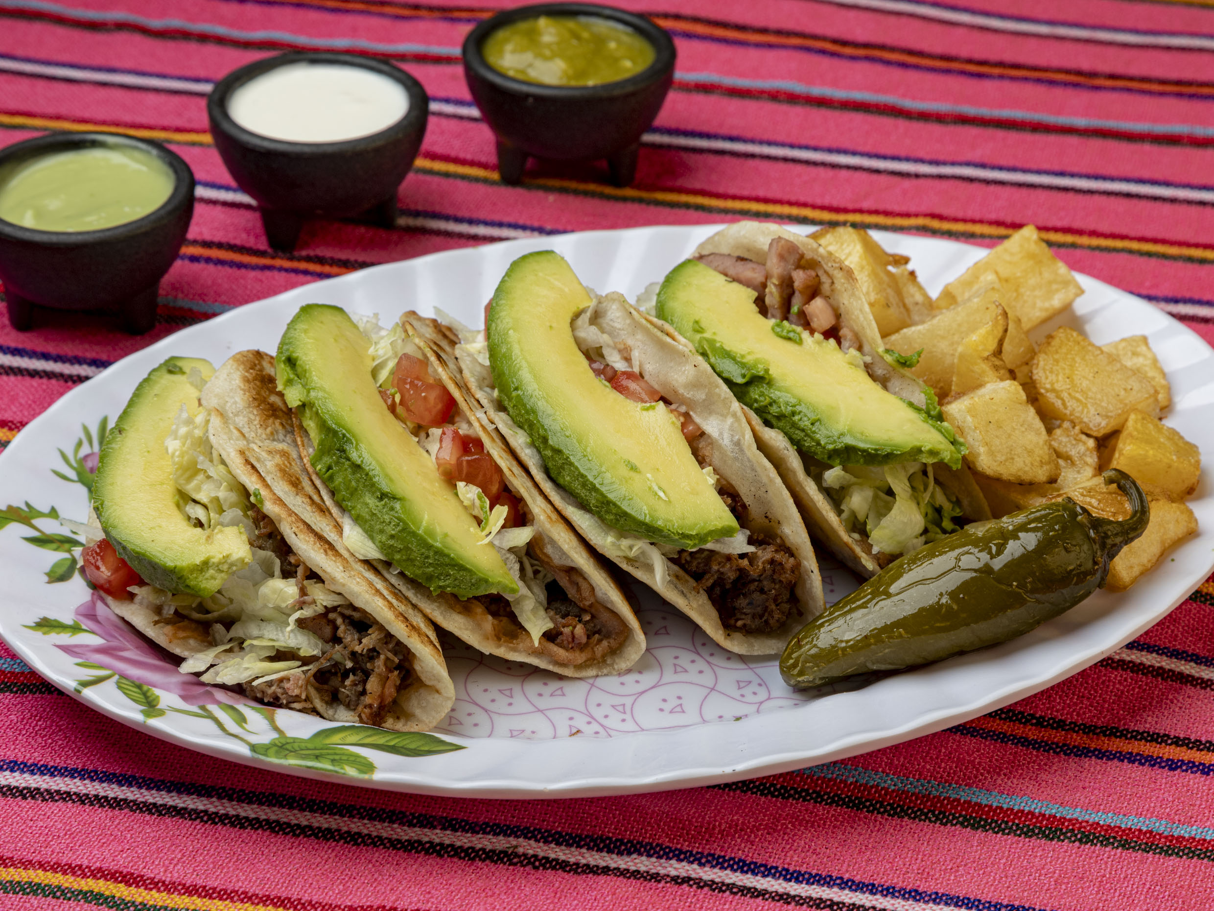 Orden 4 Piezas. En maíz con carne deshebrada de res, lechuga, tomate, Chile toreado, unas ricas papas, salsa verde, y puedes pedir guacamole en extras
