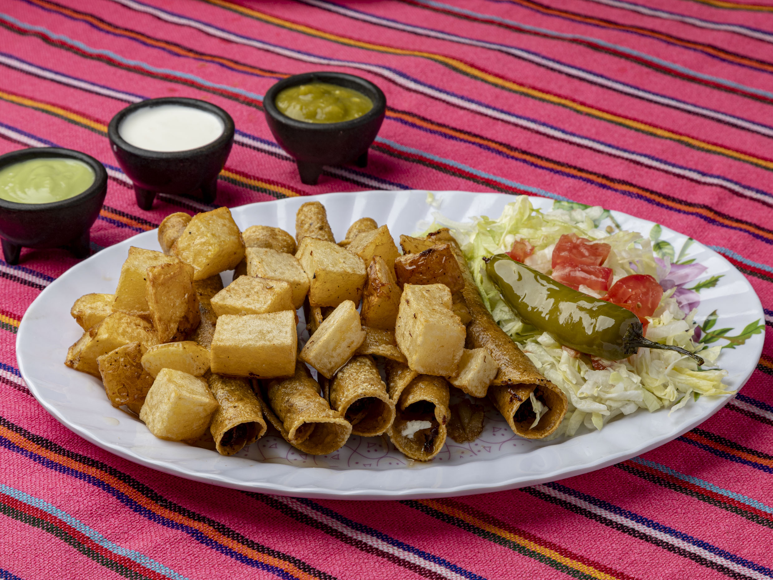 Orden 4 Piezas, incluye flautas de maiz, rellenas de carne de res deshebrada, lechuga, tomate, ricas papas, Chile toreado, crema, guacamole, su salsa verde y a disfrutar (todo por separado)..