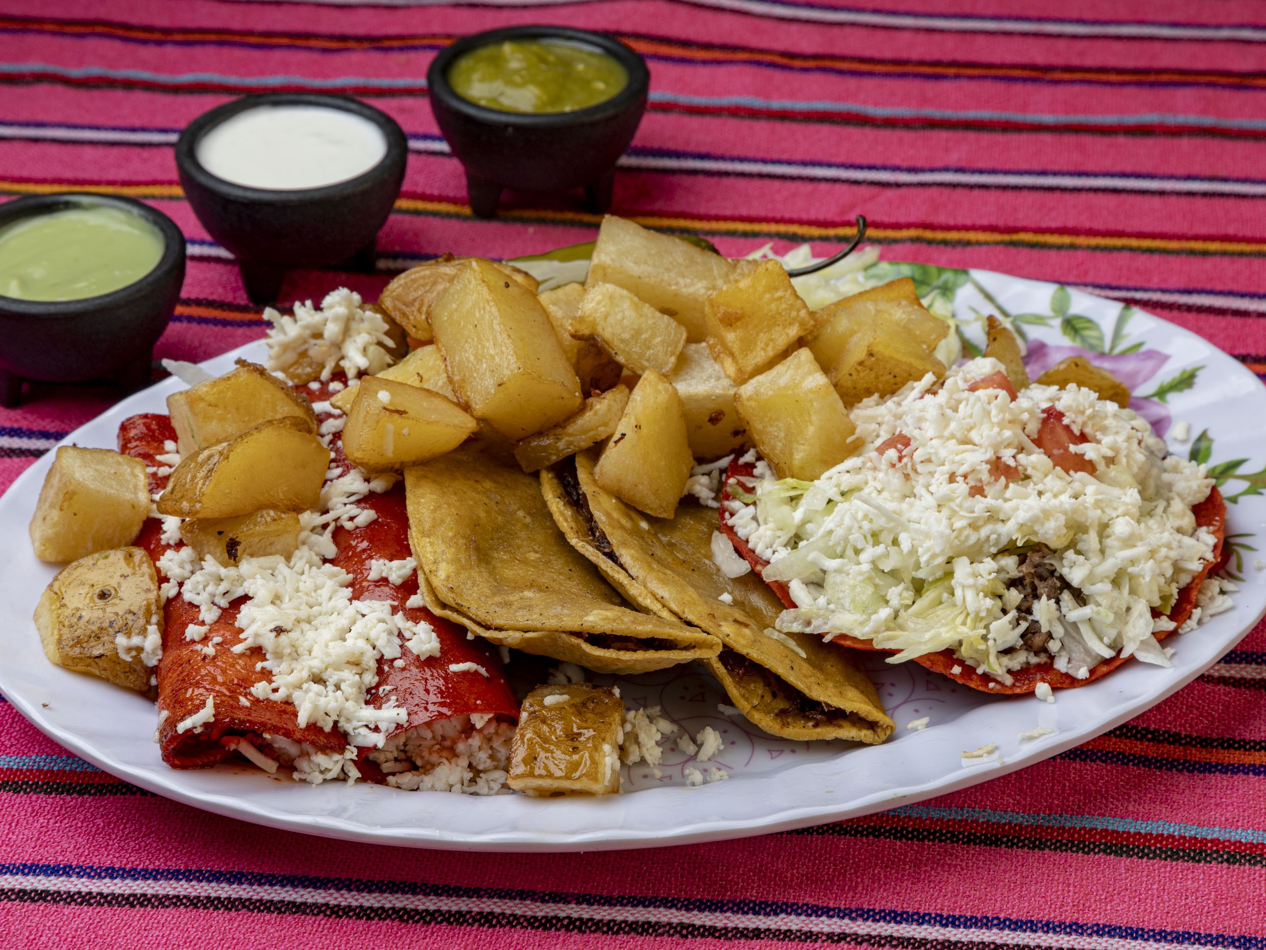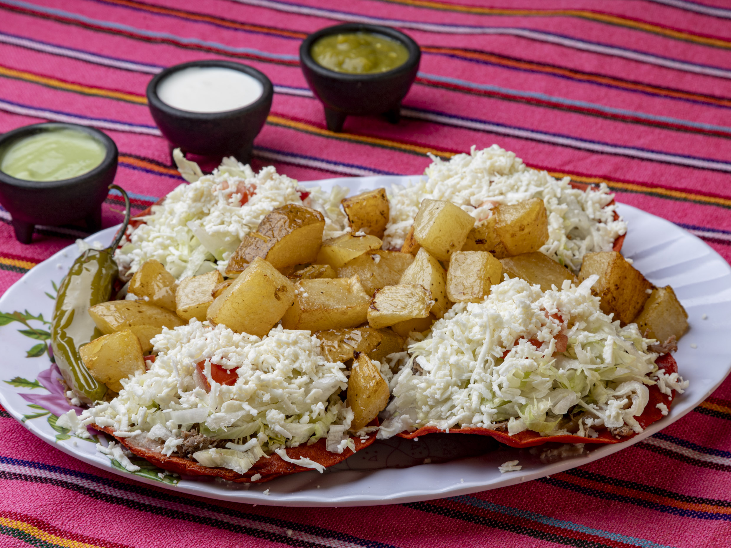Orden de 3 Piezas. Tostada roja con frijoles, queso, carne de res deshebrada, lechuga, tomate, queso, acompañadas con ricas papas, Chile toreado, crema y una rica salsa verde, puedes pedir un guacamole extra y a disfrutar un rico platillo.