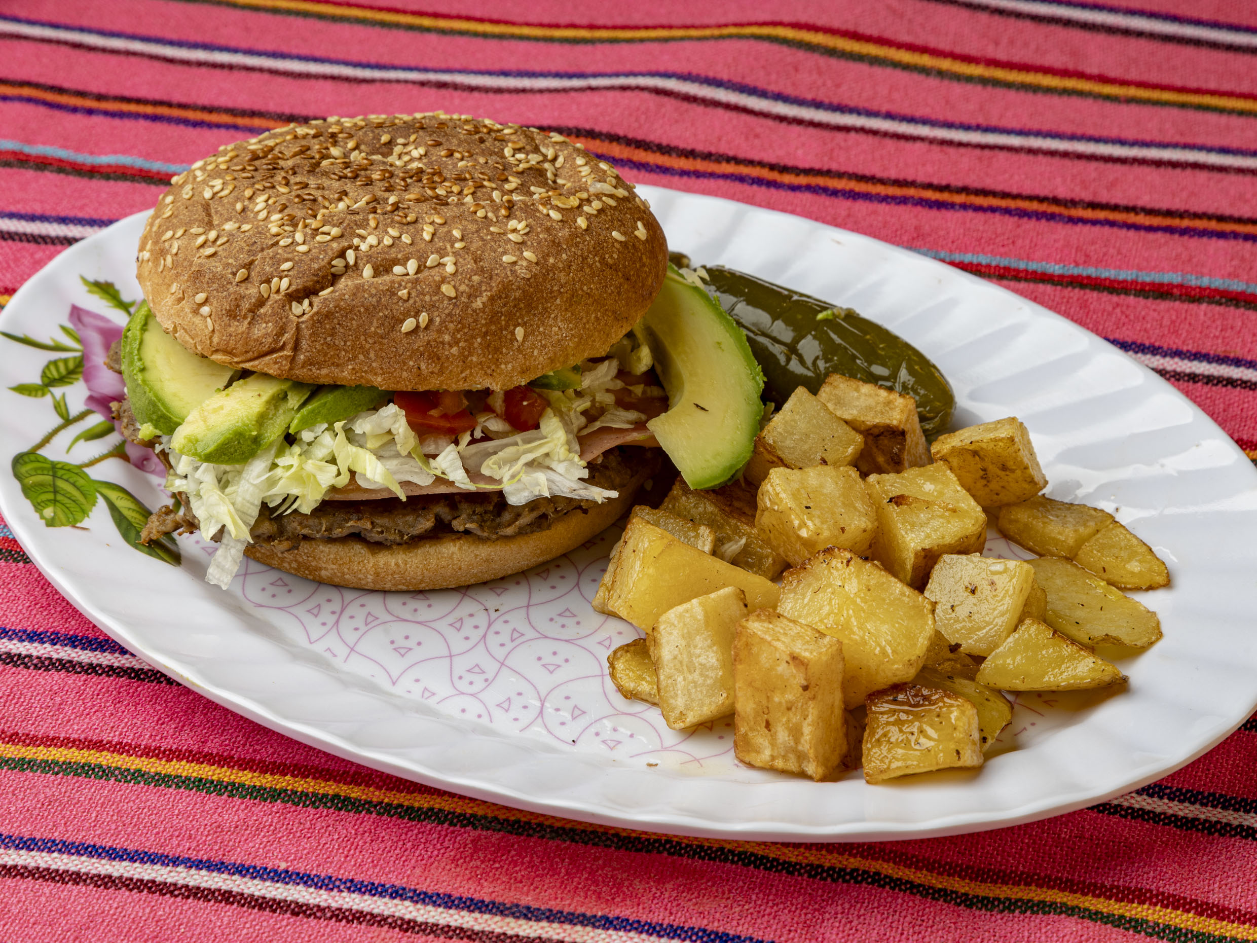 Una rica hamburguesa, Incluye carne ( pulpa de res hecha en casa), queso amarillo, jamón, lechuga, tomate, aguacate, unas ricas papas, aderezos (aparte), Chile en escabeche y a disfrutar una buena hamburguesa.)