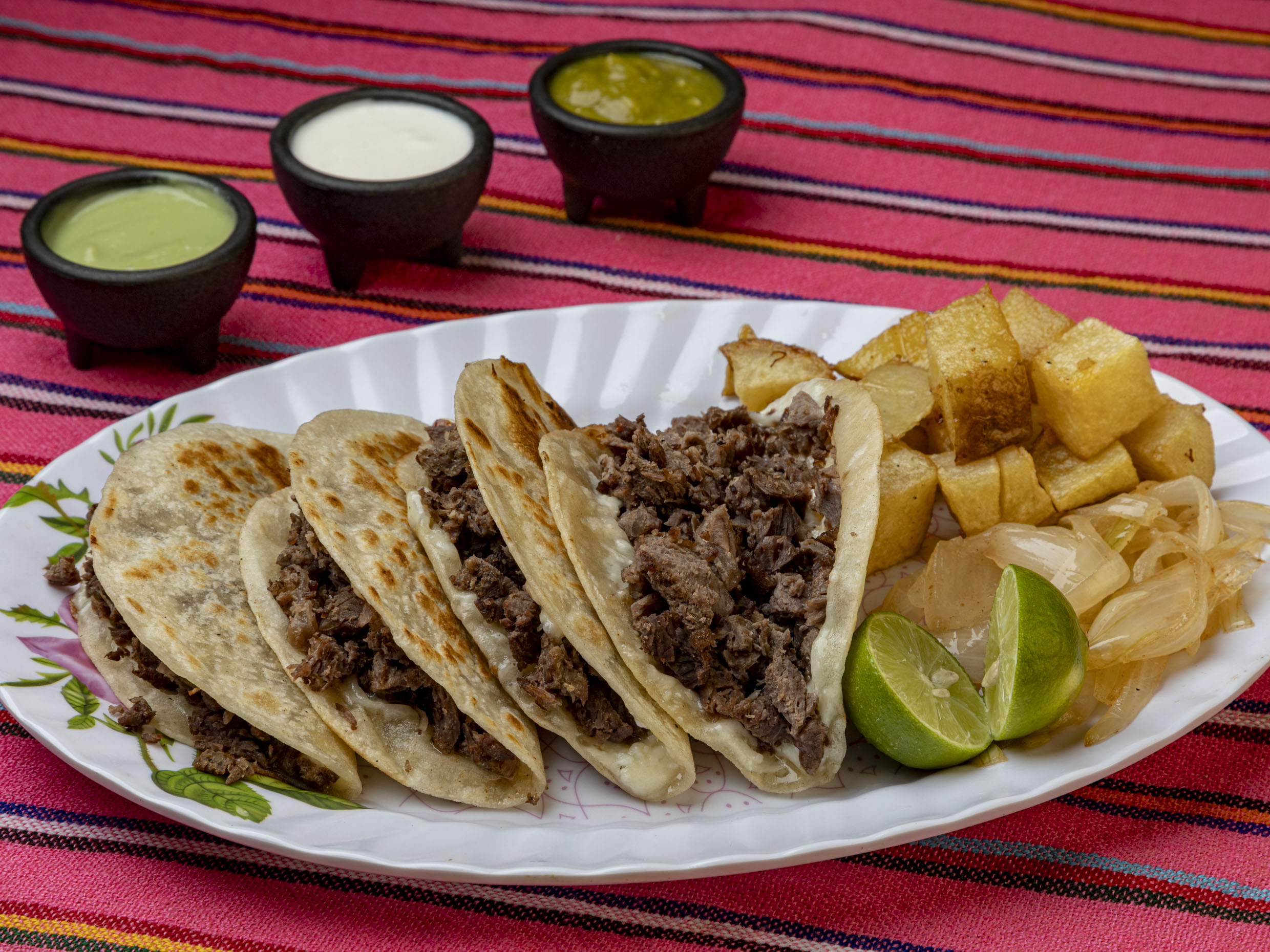 Orden de 3 Piezas. Incluye tortilla de harina, queso oaxaca, carne de bstec, acompañada de cebolla cocida, cebolla cruda con cillantro (aparte), ricas papas, salsa verde, limon y a disfrutar un rico platillo.
