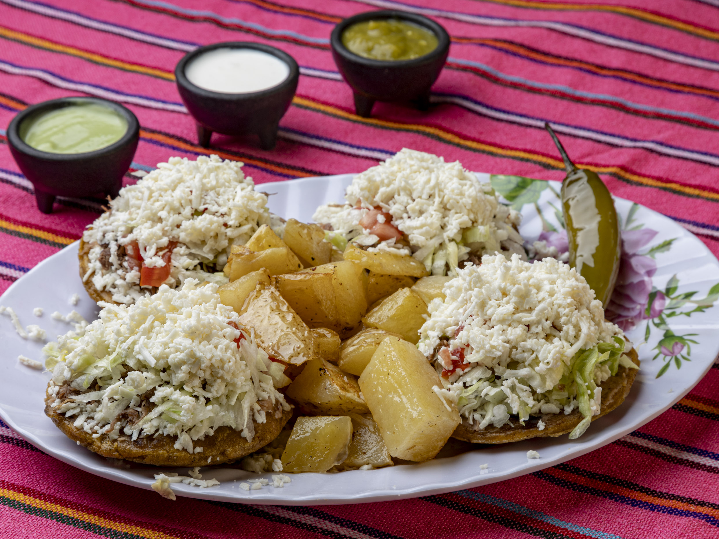 Orden de 4 Piezas. Incluye tortilla de Sope en maiz, frijoles, queso, Chile toreado, sus ricas papas, crema, salsa verde, guacamole y a disfrutar un delicioso platillo.