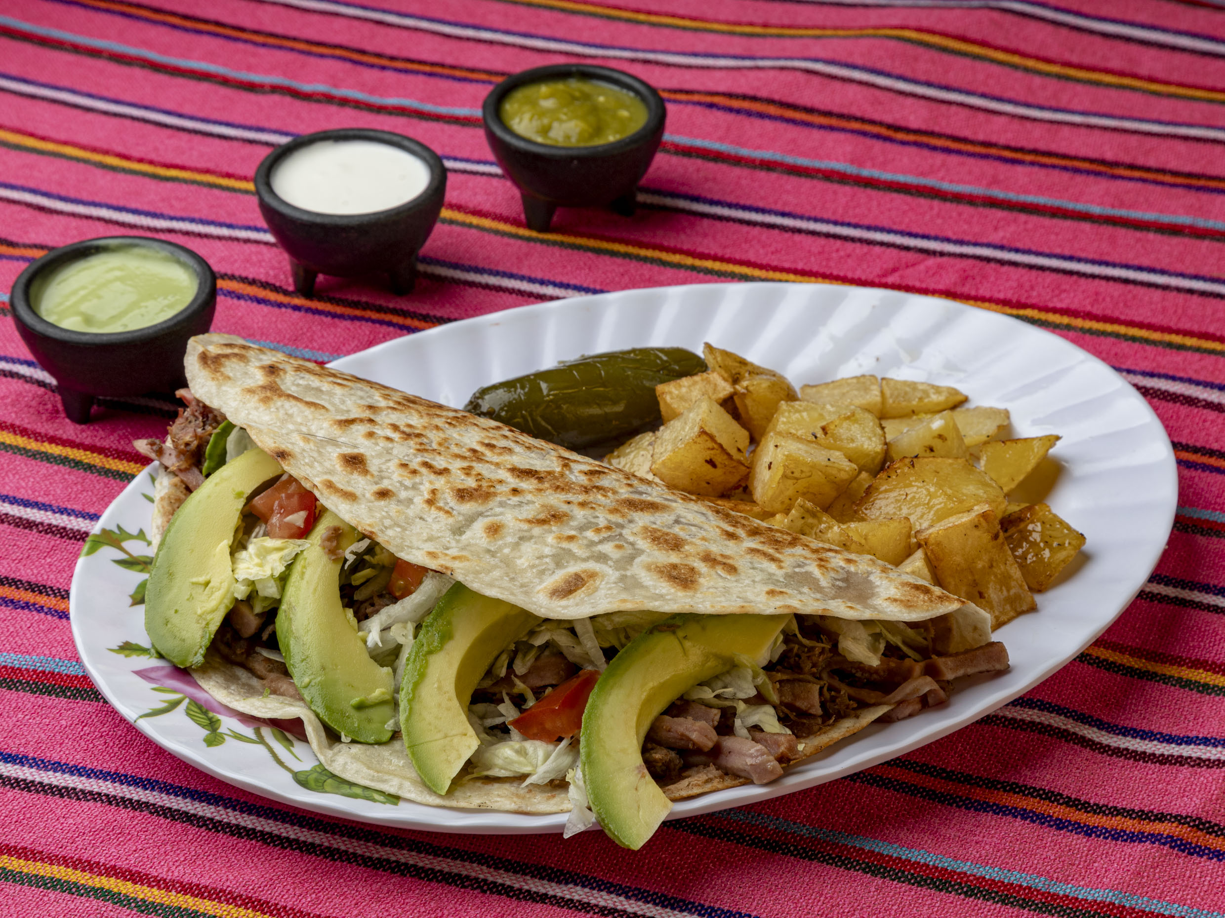 1 pieza. Incluye tortilla de harina de 30 cm, frijoles, carne deshebrada con salchicha, lechuga, tomate, aguacate, ricas papas, Chile en escabeche y Mmm a disfrutar un rico platillo.