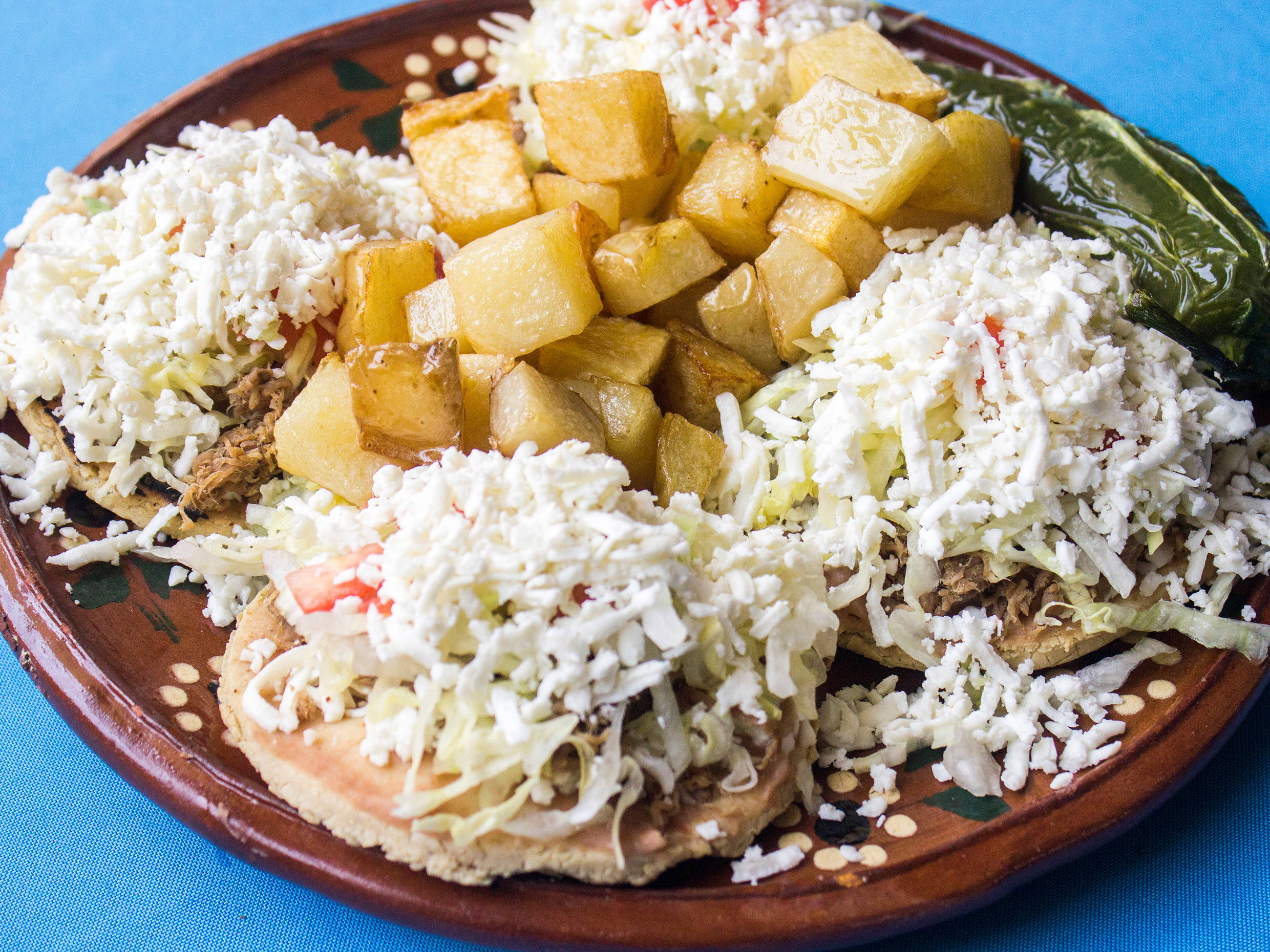 Orden de 3 Piezas. Incluye tortilla de Sope en maiz, frijoles, queso, Chile toreado, sus ricas papas, crema, salsa verde, guacamole y a disfrutar un delicioso platillo. Plato personal