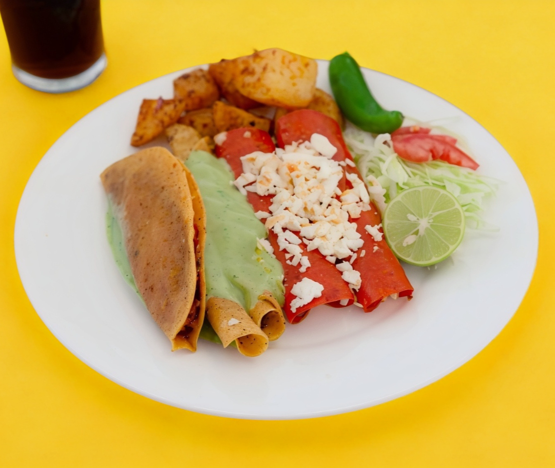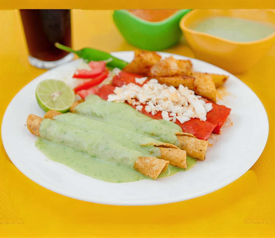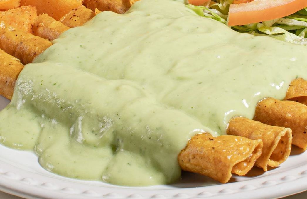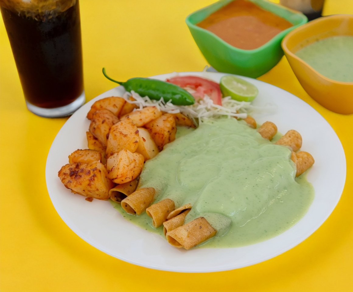 3 flautas y 2 enchiladas. Incluye: papas, ensalada, chiles toreados y salsa picante roja.