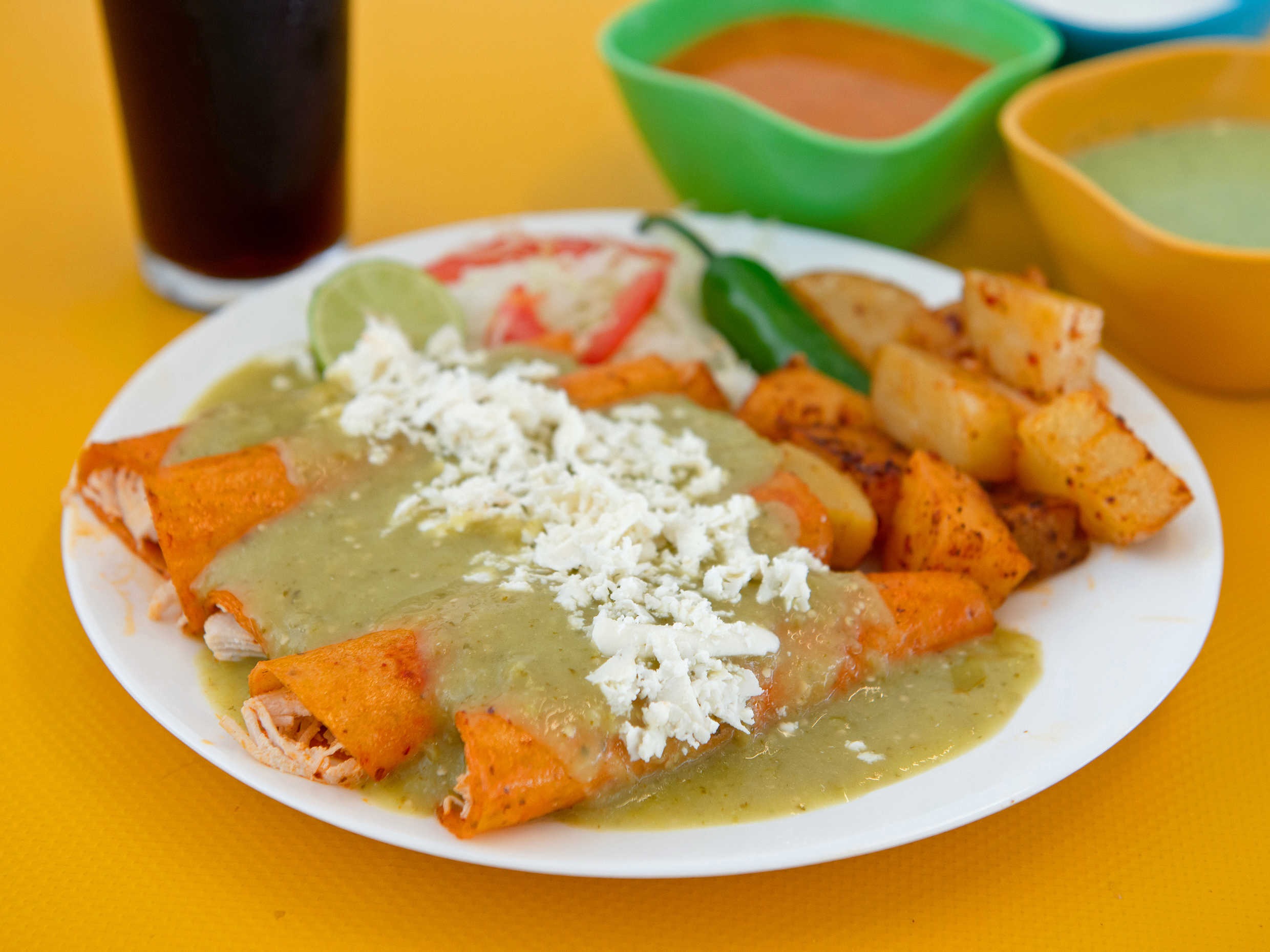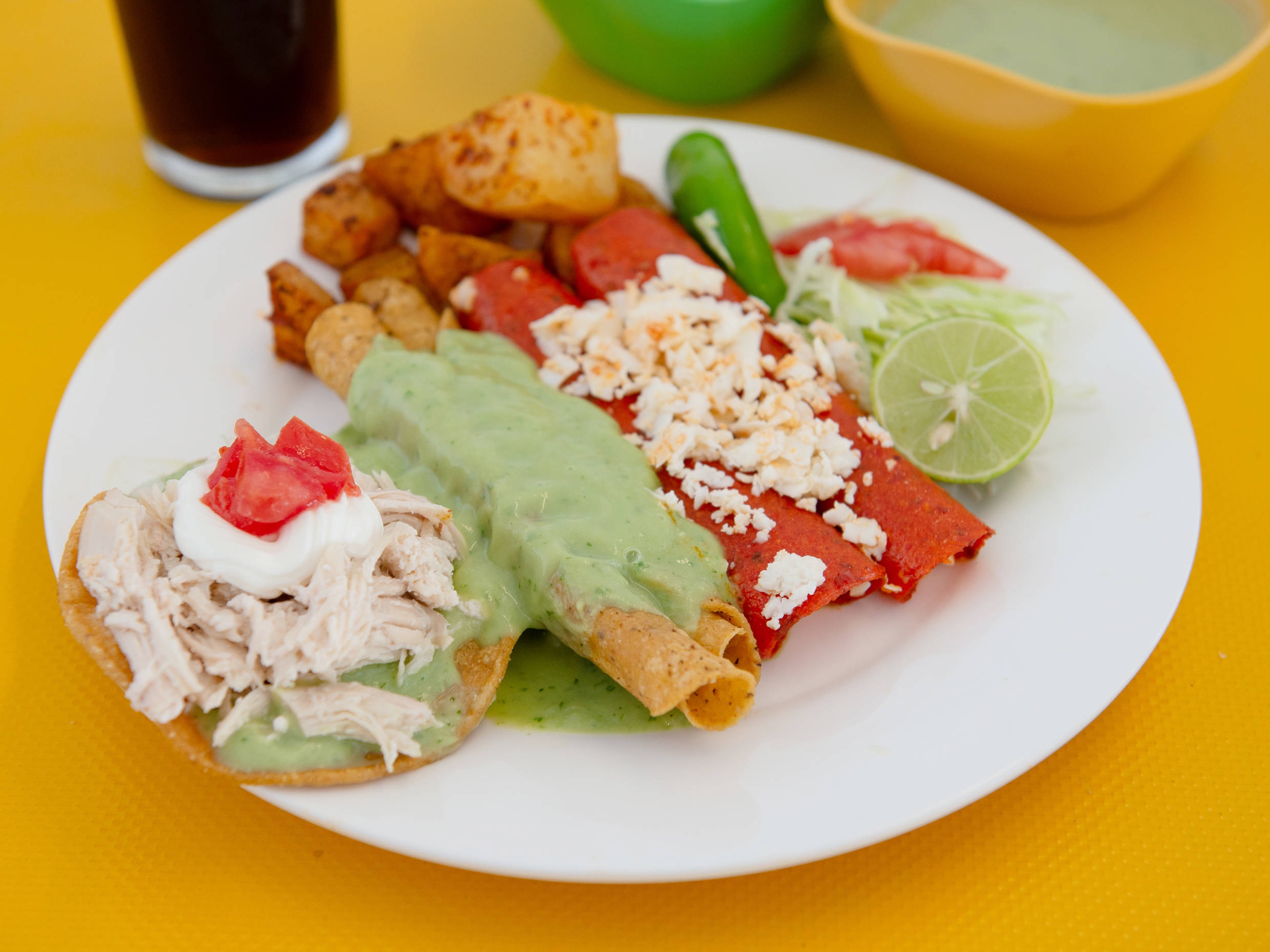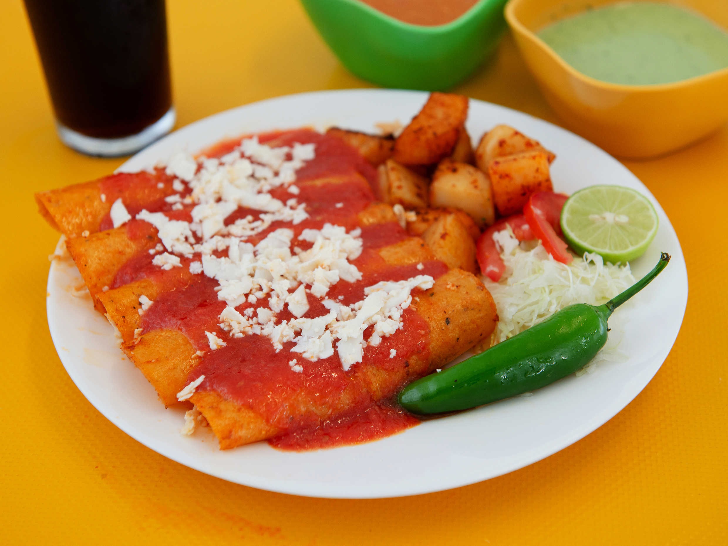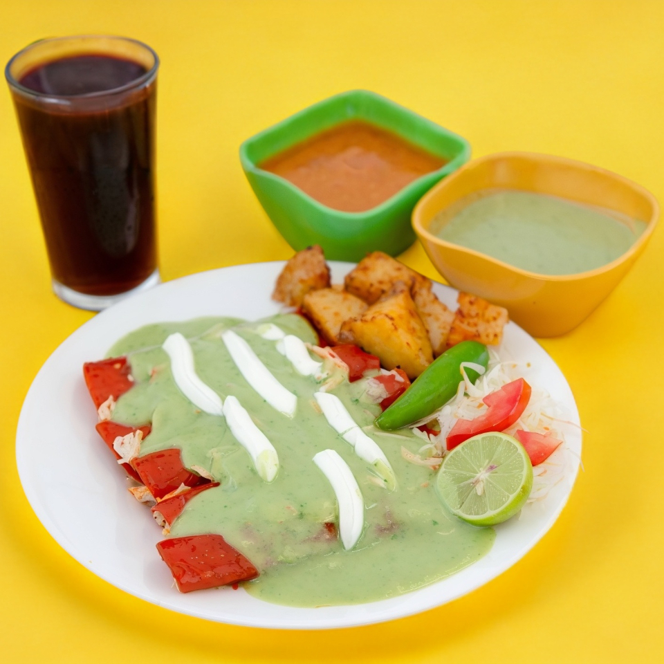 3 flautas y 2 enchiladas. Incluye: papas, ensalada, chiles toreados y salsa picante roja.