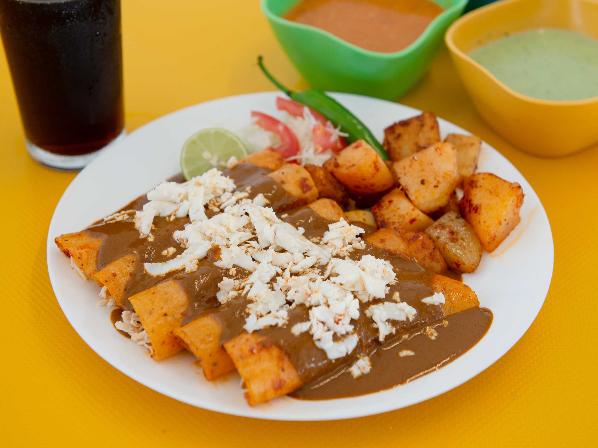 5 piezas de pollo, bañadas en mole y queso panela encima. Incluye: papas, ensalada, chiles toreados y salsa picante roja.