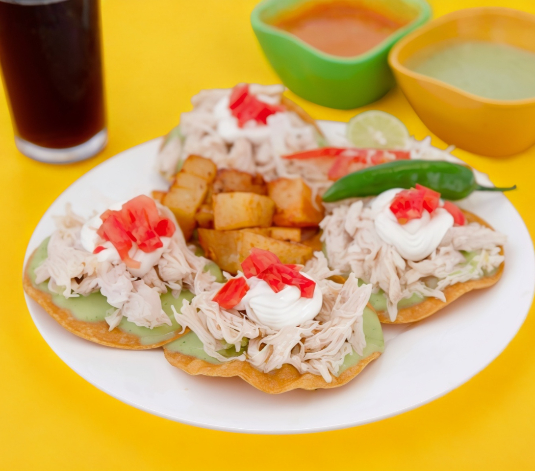 4 piezas mini tostadas de pollo, con guacamole y crema. Incluye: papas, ensalada, chiles toreados y salsa.