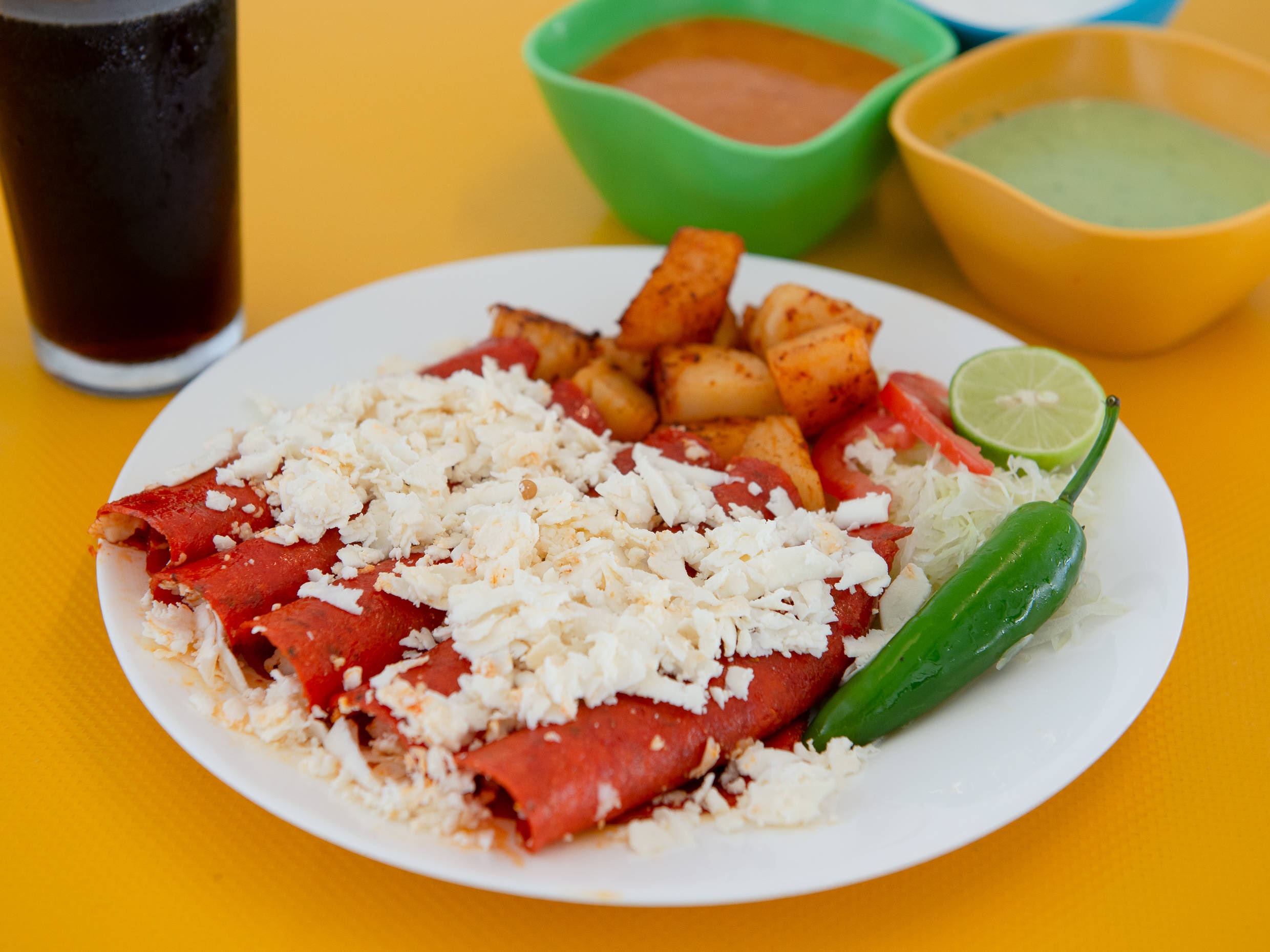 5 piezas en tortilla roja, pasadas por chile rojo, rellenas de queso panela. Incluye: papas, ensalada, chiles toreados y salsa picante roja.