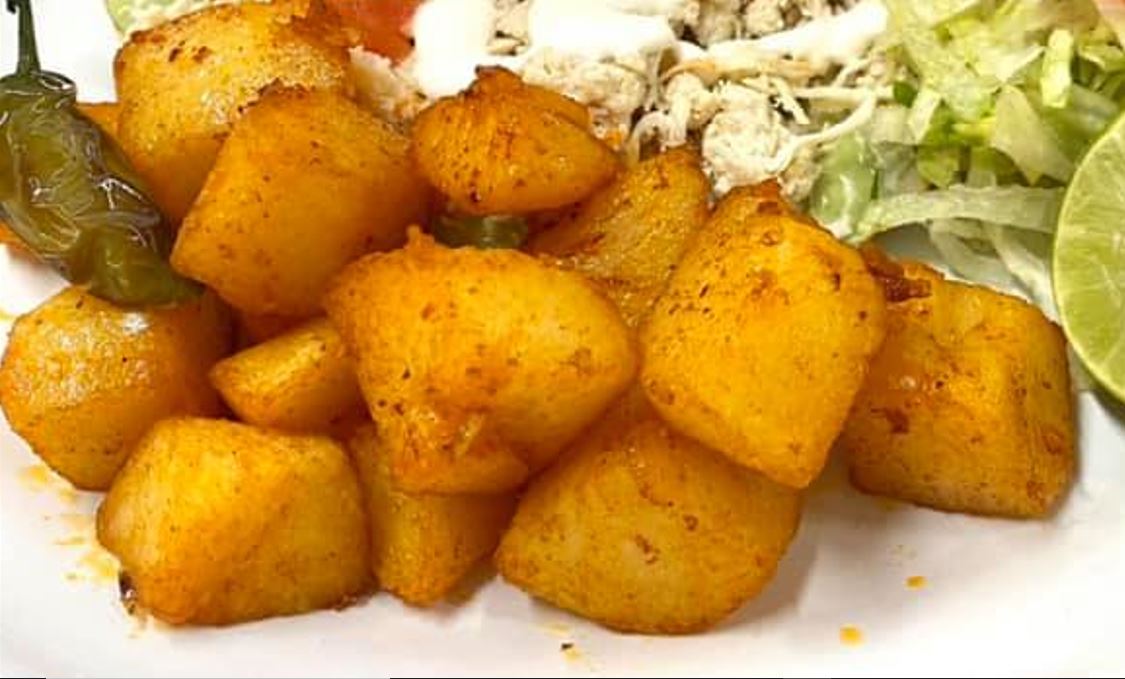 5 piezas en tortilla de maíz dorados, carne de res deshebrada con papa . Incluye: papas, ensalada, chiles toreados y salsa picante roja.