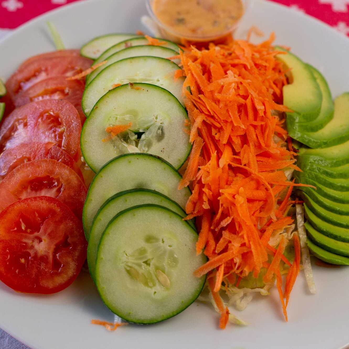 Cama de lechuga acompañada de jitomate rebanado . pepino rebanado, zanahoria rayada y aguacate rebanado con aderezo mil islas