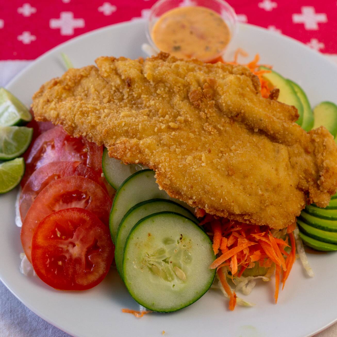 Cama de lechuga acompañada con jitomate, zanahoria , pepino aguacate y milanesa de pollo empanizada y aderezo mil islas